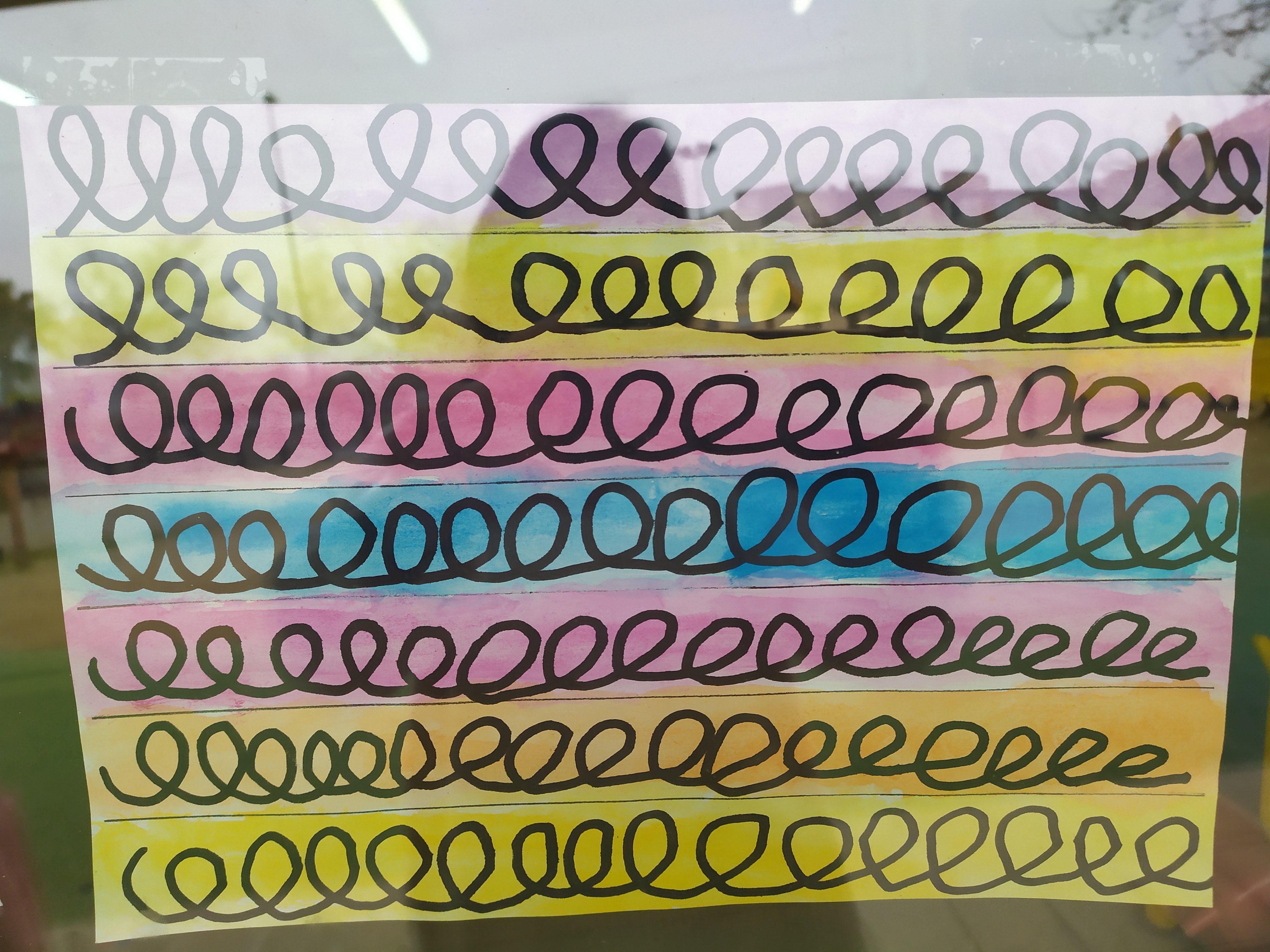 Seguint el treball iniciat la setmana passada continuem amb el traç rinxolat. Aquesta sessió primer hem representat el traç amb cordills de sabates i, a continuació, sobre un fons d’aquarel·les, hem fet rínxols amb retolador negre. Ens ha quedat una feina molt i molt bonica !!!