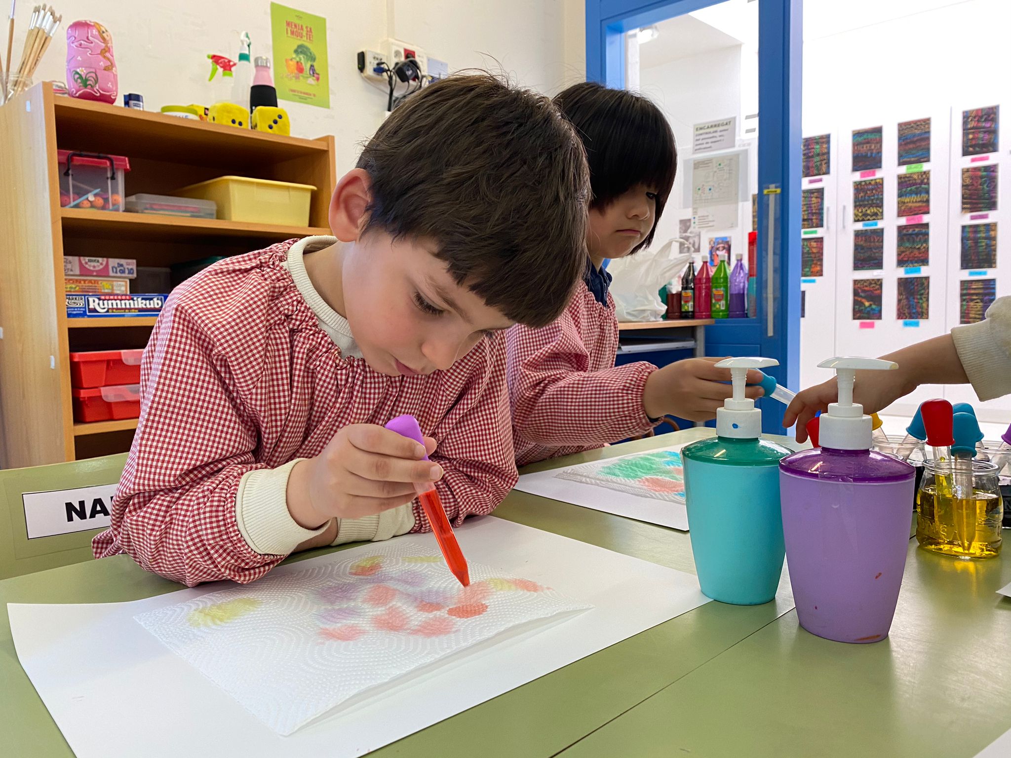 Activitat de plàstica experimental: afegim colorant alimentari a l’aigua i, mitjançant unes pipetes, pintem un paper de cuina, gota a gota, canviant de colors.