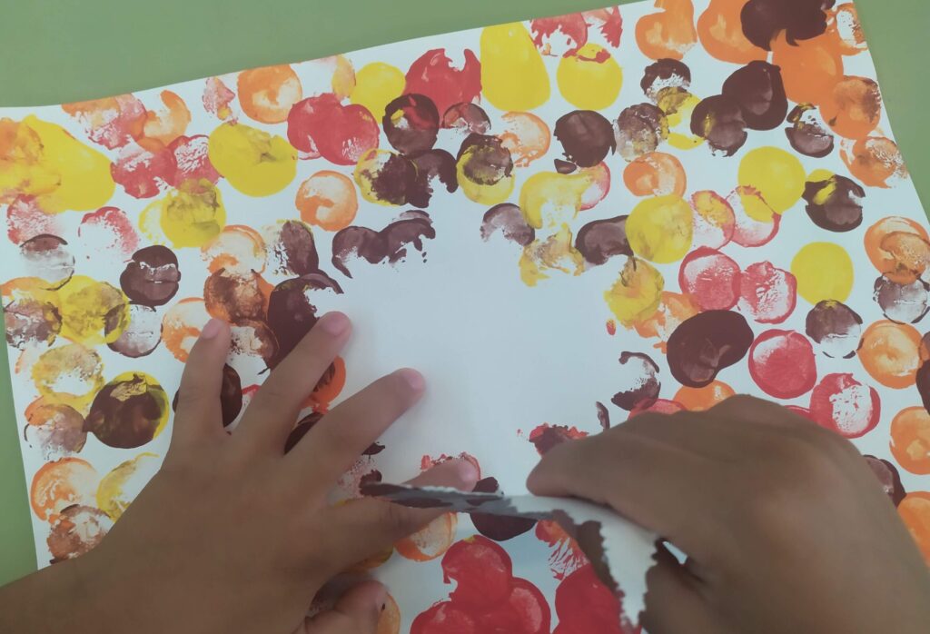 En primer lloc hem punxat una fulla i l’hem usat per crear un espai en blanc en el suport on hem estampat amb taps de suro i colors de tardor. Un cop la pintura era ben seca, hem retirat la fulla i hem enganxat aquest suport en un suport més gran. Finalment hem decorat el marc amb fulles encunyades de colors de tardor !!!