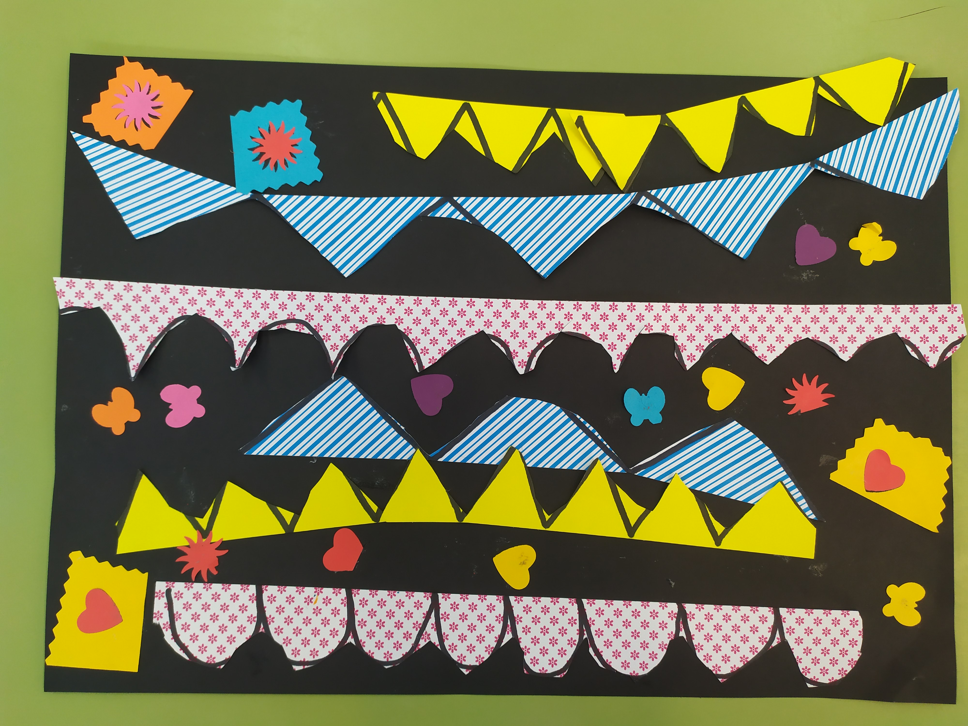 Hem retallat seguint un traç marcat, hem perforat formes diverses i hem retallat amb tisores decoratives. Finalment amb tot el material retallat, hem fet una composició lliure !!