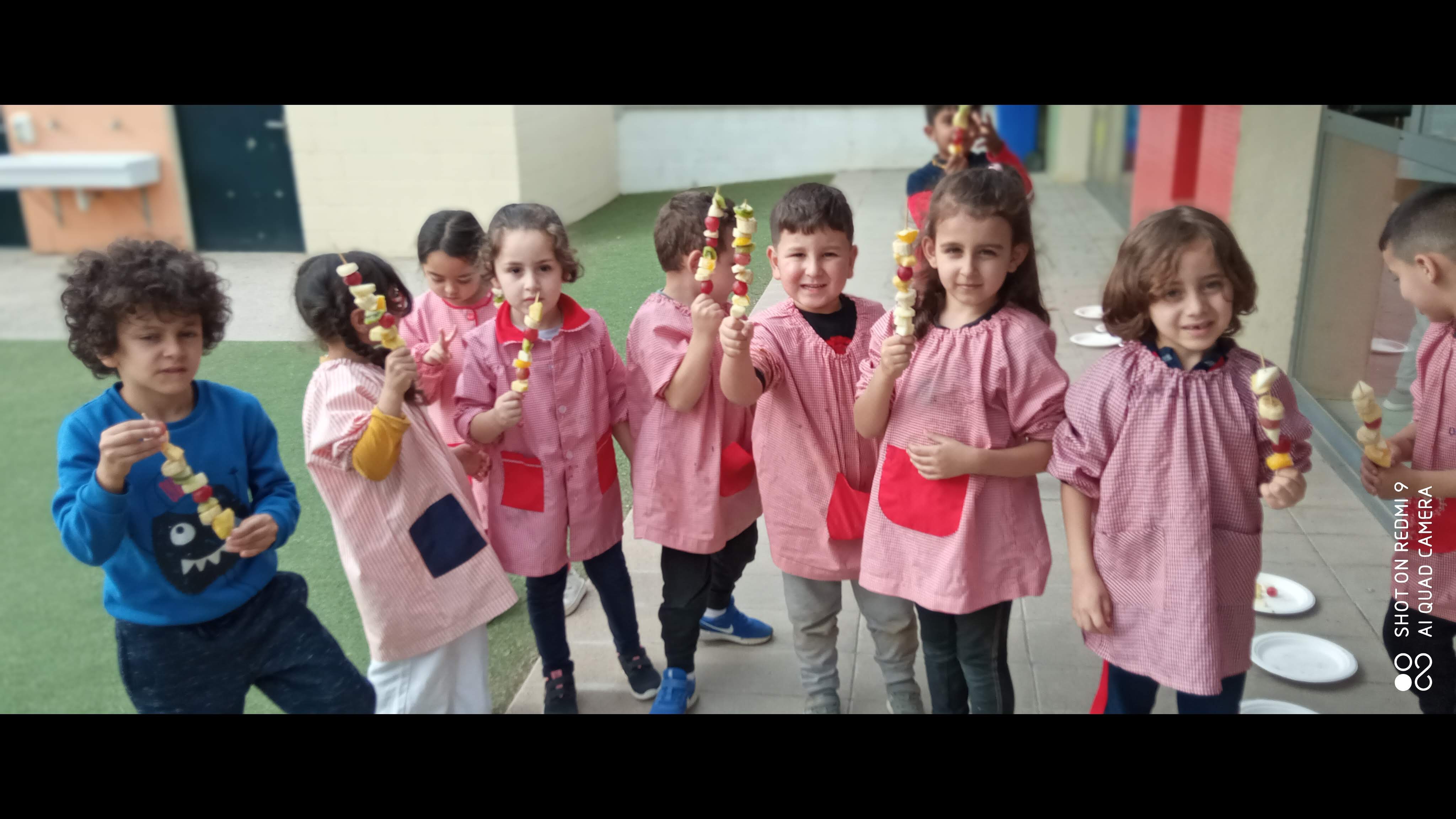 Cada any anem al teatre però aquest curs, amb el tema del COVID, ho han adaptat a les circumstàncies: ens van enviar un video i una cançó amb estil RAP, on explicaven i cantaven els beneficis de la fruita i la verdura per a la nostra salut. L’hem pogut anar veient i cantant aquests dies. També ens han portat dos tipus de cartolines , una amb enganxines de fruites per dissenyar la seva broqueta i unes altres amb fruites per pintar.