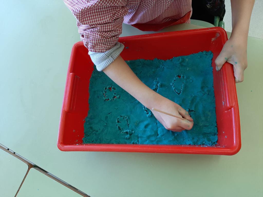 Aquesta setmana en els racons de llengua hem introduit material nou, però abans l’hem elaborat. Hem fet plastilina natural de diferents colors. Després, hi hem dibuixat lletres.
