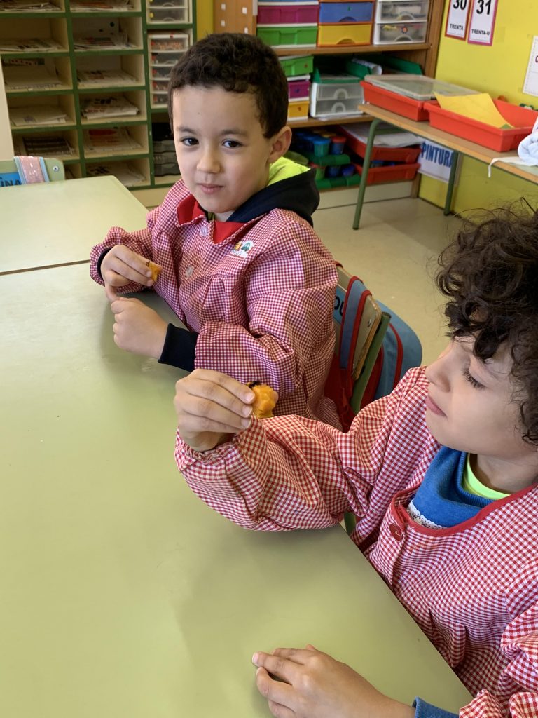 Els nens i nenes de P5B fem tastets boniatos a l’aula, producte típic de la tardor. És molt semblant a la patata però amb un gust més dolç.