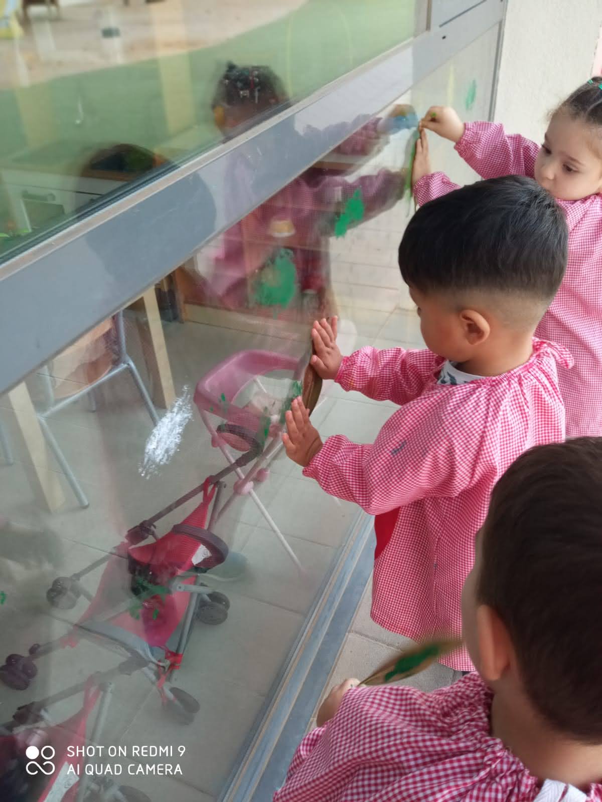 A P3 experimentem diferents tècniques plàstiques. En aquesta ocasió hem estampat amb fulles a la finestra. els nens i nenes, de manera autònoma anaven pintant les fulles i les anaven estampant a la finestra.