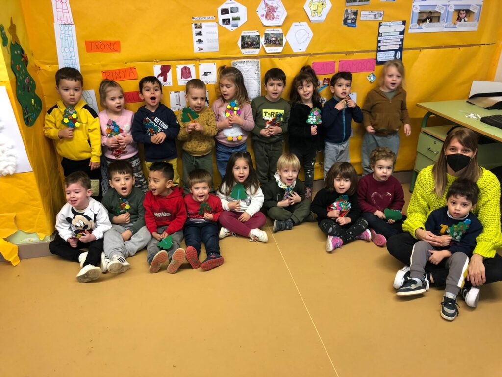 El dimarts 21 de desembre, la classe de les gates i els gats vam tenir una visita molt especial: la família del Bruno van venir a celebrar el seu aniversari. La Noèlia, la seva mare, va preparar un arbre de Nadal molt gran i el vam decorar amb gomets de diferents colors, adhesius nadalencs, unes estrelles brillants, ulls que es mouen… Cadascú va posar un motiu nadalenc a l’arbre i després en vam elaborar un individualment per casa nostra. El resultat van ser uns arbres ben macos, divertits i ben diferents!