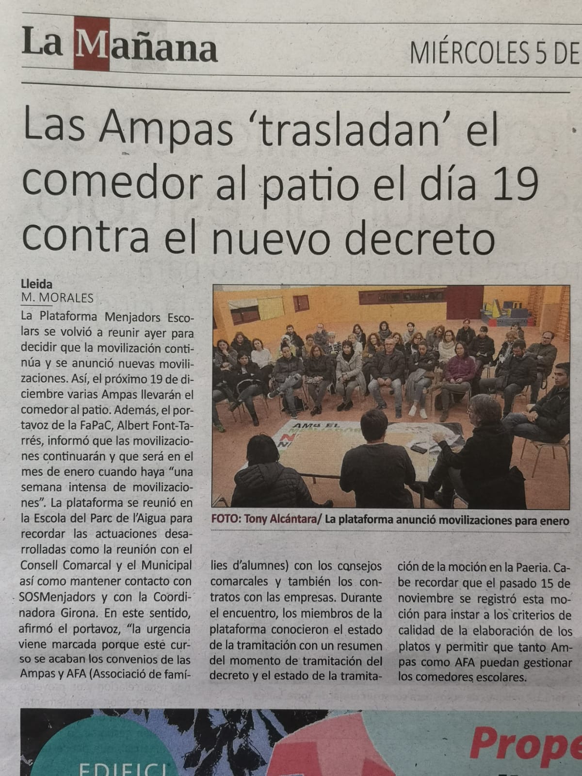 Es per això que el passat 8 de novembre es va constituir la Plataforma de Menjadors, formada per nombroses AMPES, AFAS i la FAPAC de la província de Lleida, de la qual nosaltres formem part.