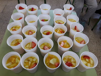 El dimecres vam decidir entre tots portar cadascú una peça de fruita i vam preparar una macedònia que portava: poma, pera, taronja , raïm, maduixes, plàtan , kiwi i suc de taronja .