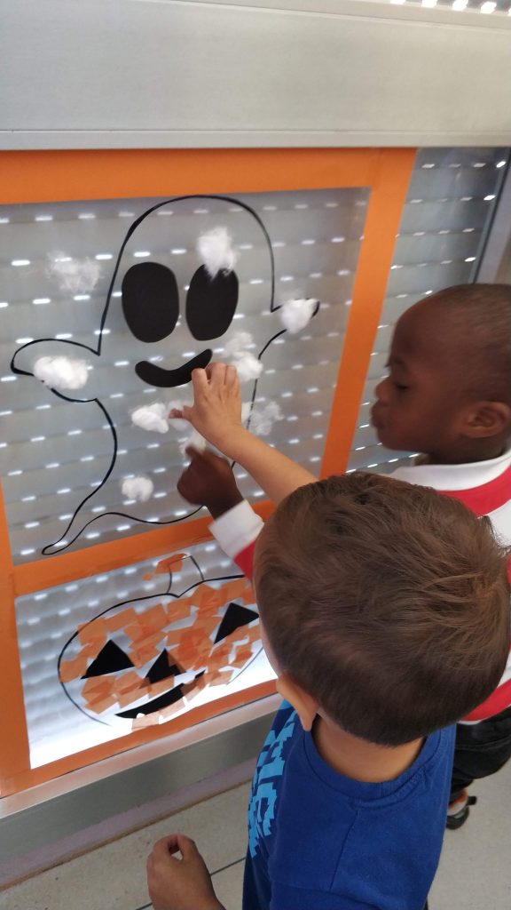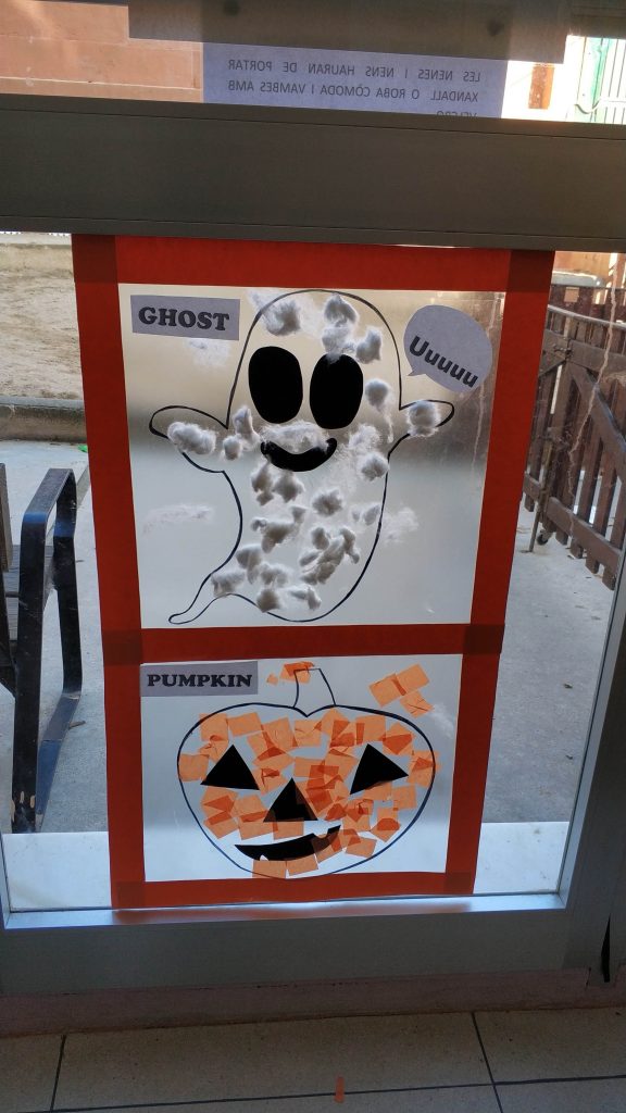 Portem diversos dies parlant de cosetes de Halloween durant les clases d’anglès i, avui, hem volgut realitzar una activitat conjunta. Entre tots, hem decorat la porta de la clase amb una pumpkin pegant-li papers de seda de color orange i un ghost amb cotó fluix. Ha sigut una tarda d’allò més terrorífica!! Uuuuuuuuuh!