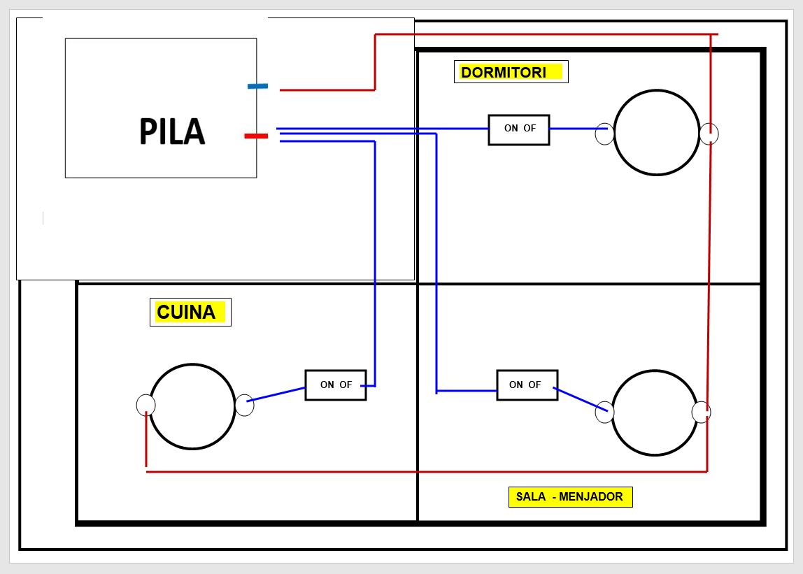 | Material necessari: Plia de 4,5 volts, 3 bombetes de 3,5 volts i el seus portabombetes,  3 interruptors (Petits) , cables de color blau i vermell. Caragolets auto-roscarts d’1 cm de llarg.  Planxa de fusta de mida DINA4 ( 30 x 20 x 1 cm). Fusta tova. Eines: Tisores escolars per tallar i pelar els cables, destornillador d’estrella i pla, alicates de punta fina, alicates tallantsHabilitats a treballar: Manipular els fils: tallar, pelar les puntes, enroscar les puntes,  Fixar el portabombetes (enroscar-lo a la fusta, fixar els fils als caragols) Aprenentatges: Fer una aproximació a la realitat. Distribuir el corrent en tres habitacions.  |
