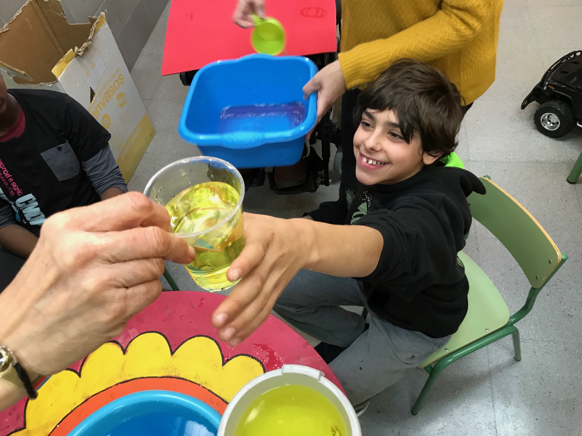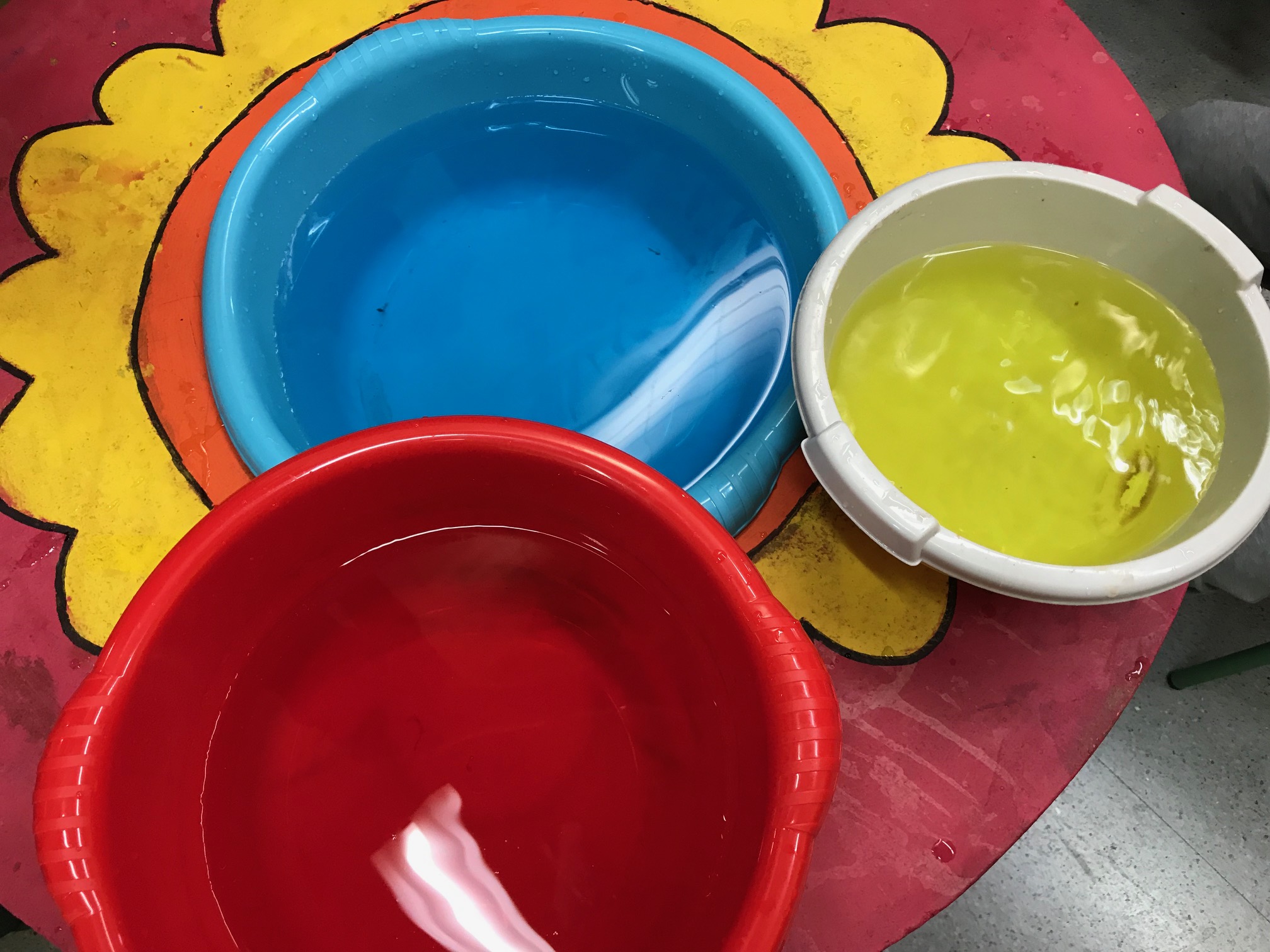 Aquest trimestre treballarem varies vegades amb l’ambient d’aigua. Avui hem treballat l’aigua freda, calenta i tèbia i ho hem relacionat amb els seus colors corresponents, blau/vermell.