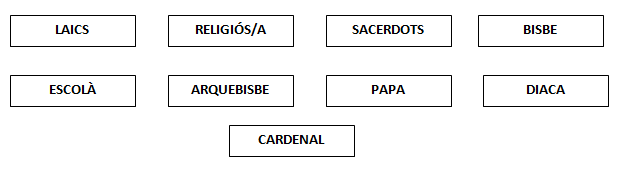 Aquesta setmana treballarem els membres que formen part de l’Església. L’Església està formada pels cristians , és a dir els seguidors de Crist. Però dins de l’Església no tots els fidels tenen el mateix càrrec . En aquesta imatge en trobareu alguns.