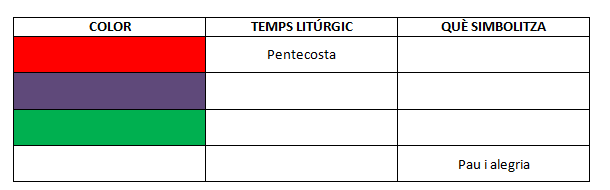 Segons el temps litúrgic del calendari en què ens trobem el mossèn porta la casulla d’un color o d’un altre. Investiga quan s’utilitza cada un dels colors i acaba d’omplir la graella.