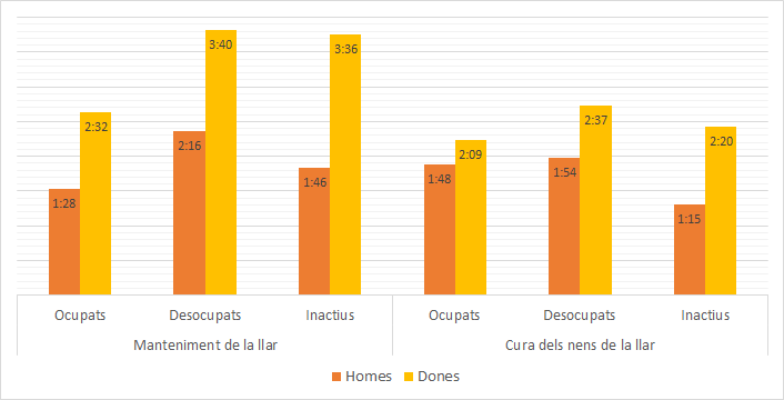 Les diferències de gènere en el temps que es dedica a la llar són independents de la relació laboral; és a dir, tinguin feina fora de casa o no. Fins i tot, en el cas que més convergeix, les dones treballadores hi dediquen més temps que no pas els homes inactius o desocupats.