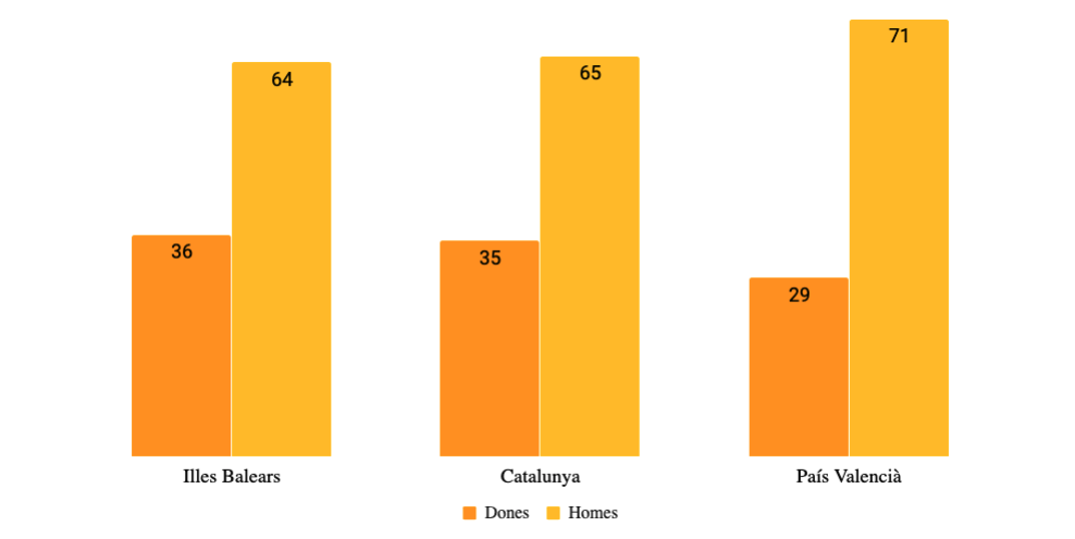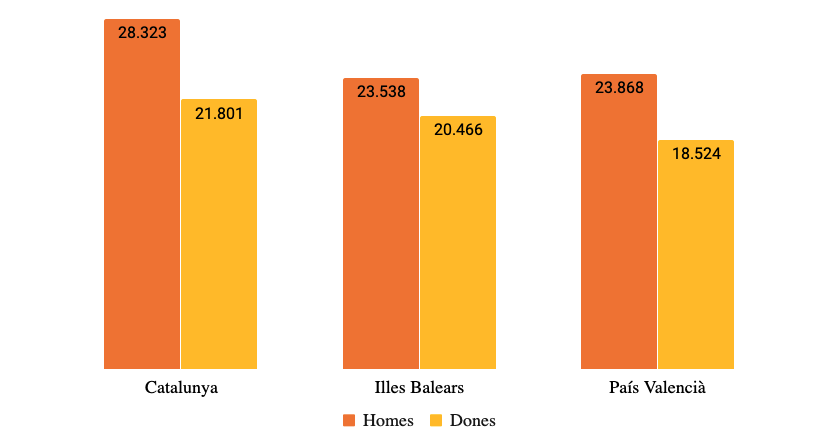 Una de les desigualtats més evidents és la diferència de salari entre homes i dones. Als Països Catalans, els homes cobren entre 3.000 euros i 6.500 més que no pas les dones, una disparitat que es manté encara que s’ajusti per factors.