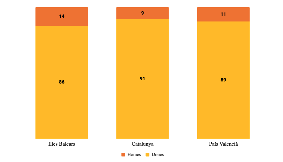 De totes les excedències demanades als Països Catalans per a atendre els familiars, inclosos els fills, el 90% són de dones (15.077 sol·licituds). Una dada que va lligada al fet que hom les associa a aquestes tasques.