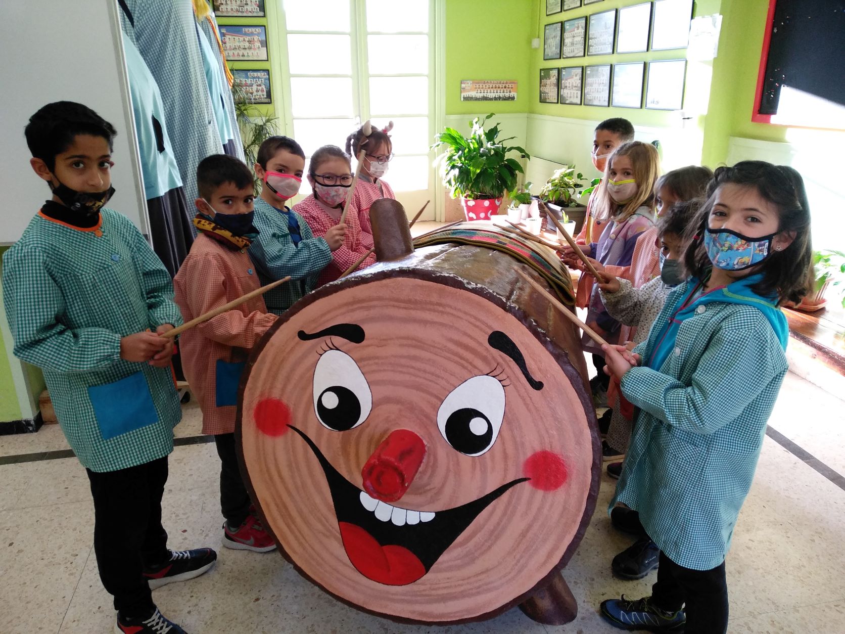 Ara fa uns dies ha arribat el tió a escola i li hem anat portant peles de mandarina per engreixar-lo bé. Avui l’hem fet cagar i ens ha cagat monedes de xocolata, un pot fer bufar i fer ampolles, una bossa de llaminadures i un puzle.