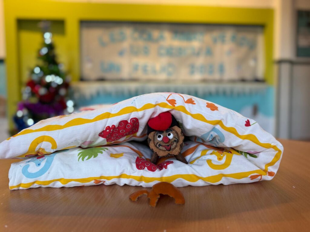 La setmana passada vam sortir d’excursió per buscar el Tió de Nadal, durant aquesta setmana,  l’hem cuidat i alimentat cada dia perquè recuperés forces. El Tió tenia molta gana, i li hem donat tot el que li agrada: mandarines, pells de plàtan, pa i galetes. S’ho ha menjat tot! 🍊🍪 Avui, divendres 20, quan hem