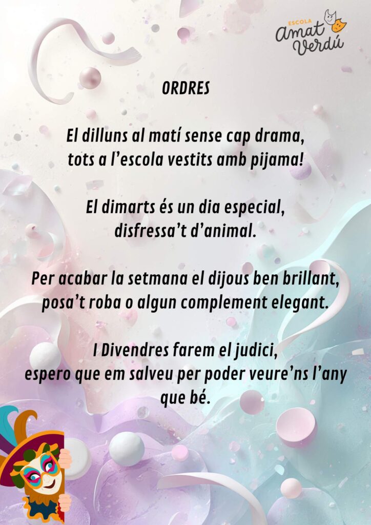 Avui ha arribat Sa Majestat Carnestoltes i ens ha deixat les normes que haurem de complir la propera setmana. Us podeu descarregar el pregó per estar ben assebentats i assebentades de les consignes de la setmana.