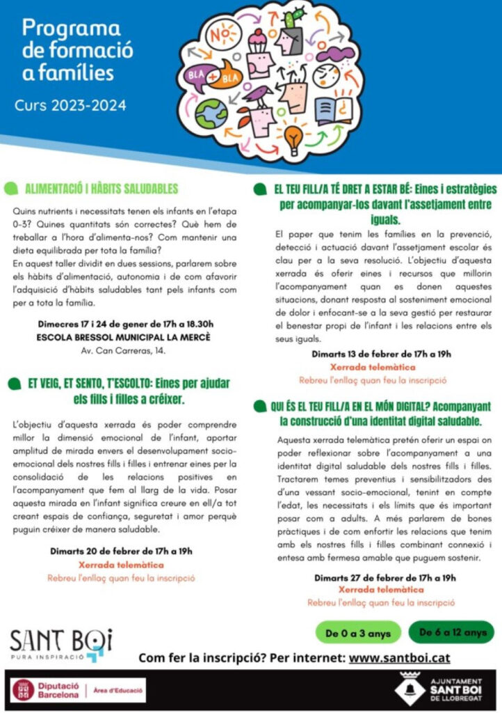 us informem de les formacions que organitza l’Ajuntament de Sant Boi durant aquest segon trimestre adreçada a les famílies i que pensem poden ser del vostre interès. La inscripció l’heu de fer a Formació famílies