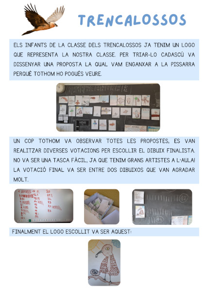 ELS INFANTS DE LA CLASSE DELS TRENCALOSSOS JA TENIM UN LOGO QUE REPRESENTA LA NOSTRA CLASSE. PER TRIAR-LO CADASCÚ VA DISSENYAR UNA PROPOSTA LA QUAL VAM ENGANXAR A LA PISSARRA PERQUÈ TOTHOM HO POGUÉS VEURE.