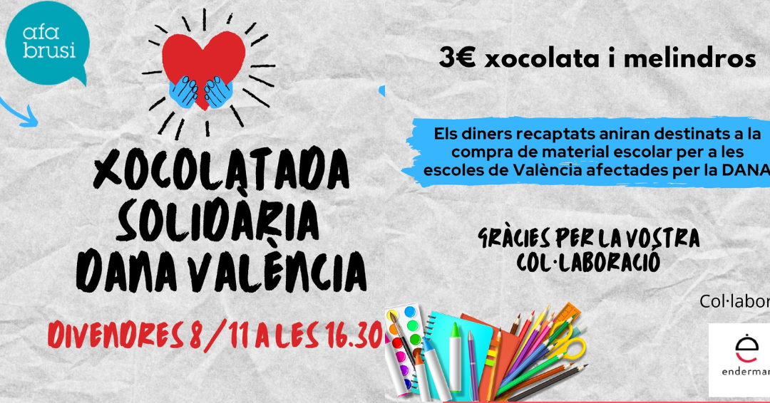 Aquest divendres l’AFA organitza una xocolatada solidària per recaptar fons amb l’objectiu d’ajudar les persones afectades per la DANA a València i contribuir a la compra de material escolar.