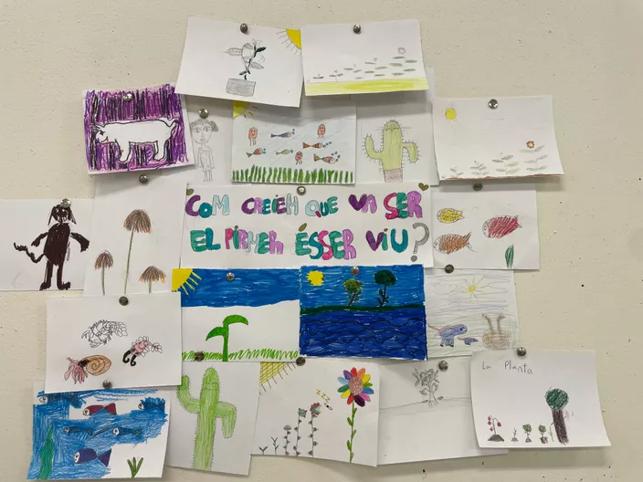 Ens hem preguntat com era el primer ésser viu, i sense gaire informació prèvia hem dibuixat com creiem que era. Ens ha sobtat molt descobrir que no era com nosaltres ens l’imaginàvem. La DICKINSÒNIA és una mena d’ameba gegant, era com una espècie de cuc/corall amb el cos segmentat. Vivia als mars i oceans i ha estat descoberta fa uns 75 anys a les muntanyes d’Austràlia.