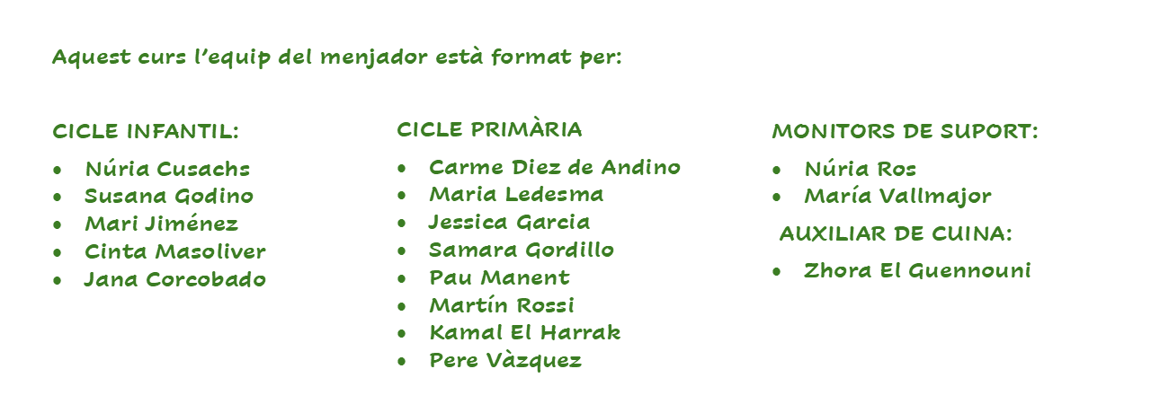 Al nostre menjador, l’objectiu principal és que els nens i nenes gaudeixin del menjar, així com aconseguir un bon ambient. Es treballen diferents aspectes, com educar el paladar, una dieta equilibrada, els hàbits d’higiene i els hàbits de convivència.
