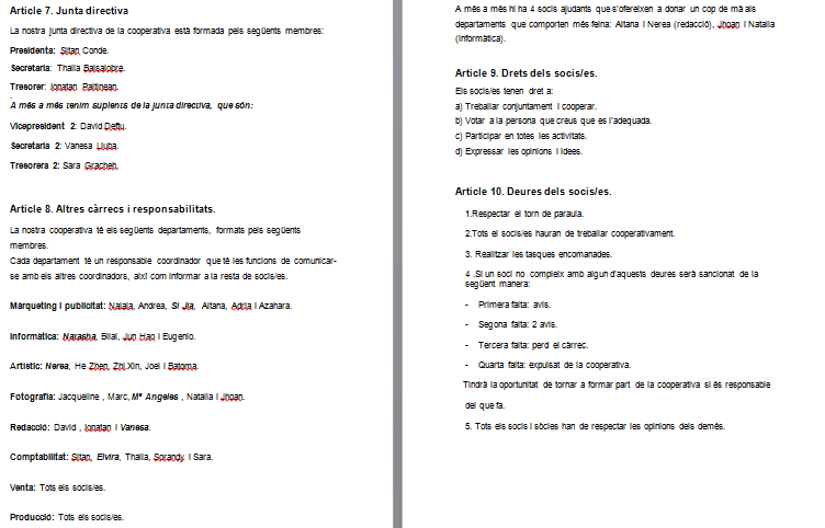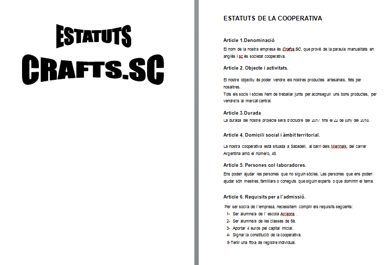 Per poder-los fer ens vam repartir la feina entre 4 grups, i cada grup havia de fer 3 o 4 articles diferents. Quan ja els teníem escrits els vam ajuntar i vam fer una reunió per veure si tots estàvem d’acord amb els estatuts  redactats i aprovar-los per majoria.