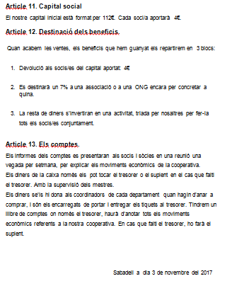 A més a més explica diferents coses: el nom de la nostra empresa, el Nº de socis que són 28, cada soci/sòcia havia d’omplir una fitxa de registre totes les decisions havia fet i les que farem seran escollides democràticament amb els socis i sòcies. Vam decidir que cada soci i sòcia aportarà 4€ i en total dona 112€ de capital inicial.