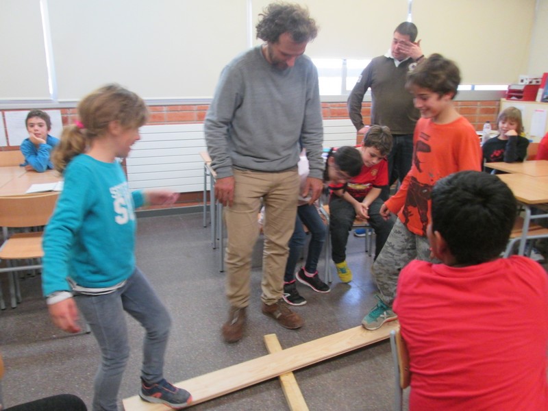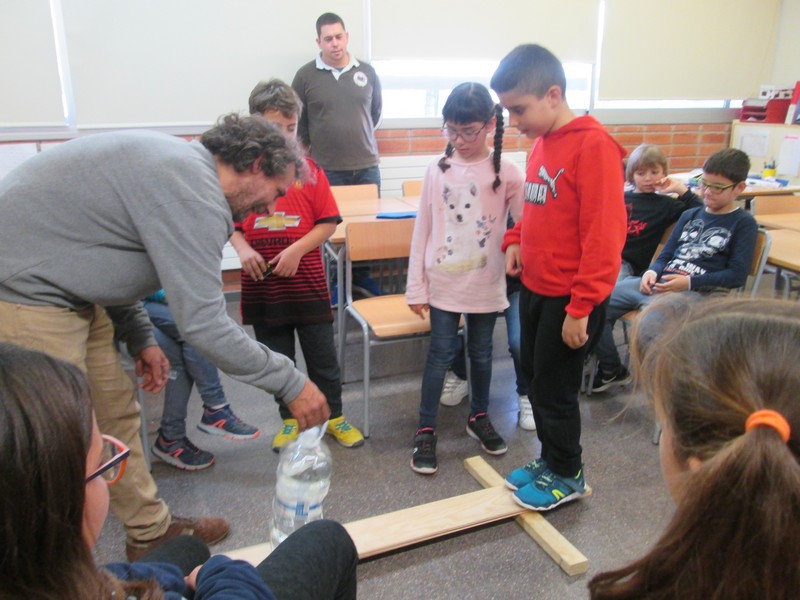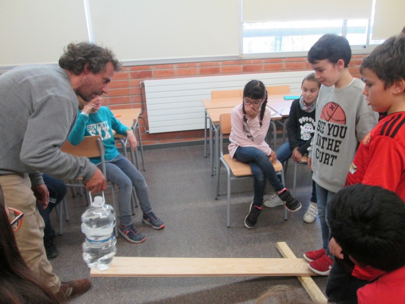 Va construir una palanca i posant una ampolla de 5 litres vam veure que s’igualava al pes del Pol. Vam comprovar que si augmentàvem la distància entre el punt de suport i la força que fèiem, ens era més fàcil aixecar-nos.