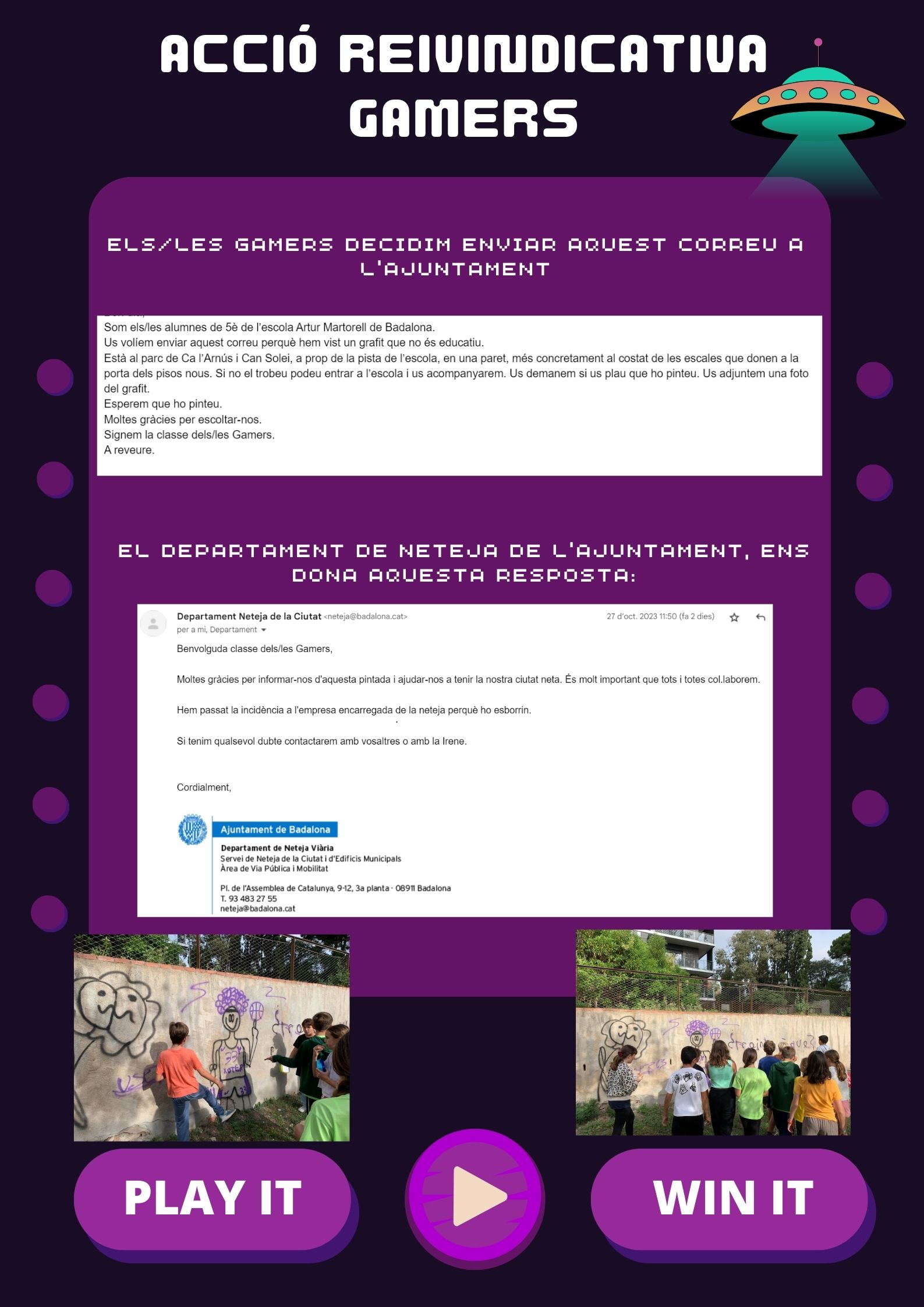 El passat divendres 27 d’octubre els/les Gamers decideixen enviar un correu a l’Ajuntament mostrant el seu desacord amb el grafiti que hi ha a la paret de la pineda del parc de Can Solei i Ca l’Arnús.