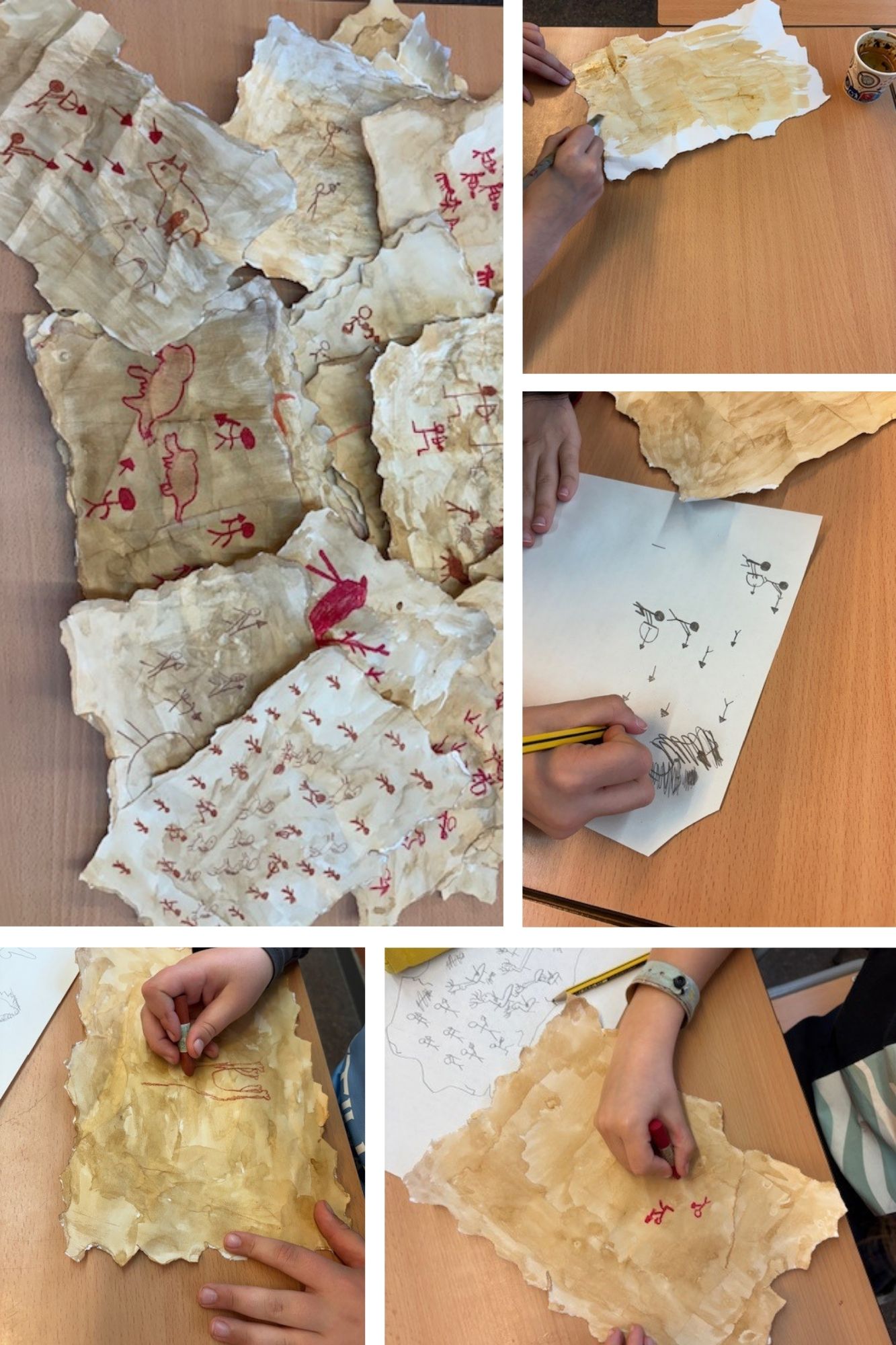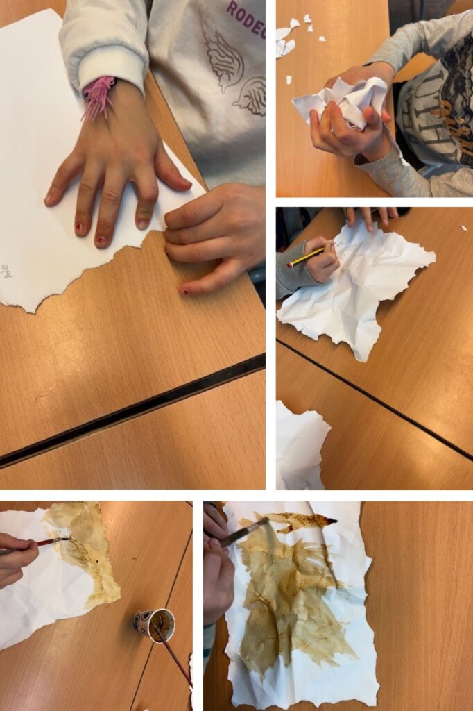 El procés ha estat molt creatiu i divertit! Primer, hem agafat un full de paper i l’hem arrugat per donar-li textura. També hem trencat les vores perquè semblés més autèntic. Després, hem fet una barreja d’aigua i cafè per pintar el full, aconseguint un efecte envellit. Mentre esperàvem que el paper s’assequés completament, hem fet esborranys i dissenys dels nostres dibuixos. Finalment, hem donat vida a les nostres creacions amb ceres de colors terra, inspirant-nos en les pintures prehistòriques que hem estudiat.