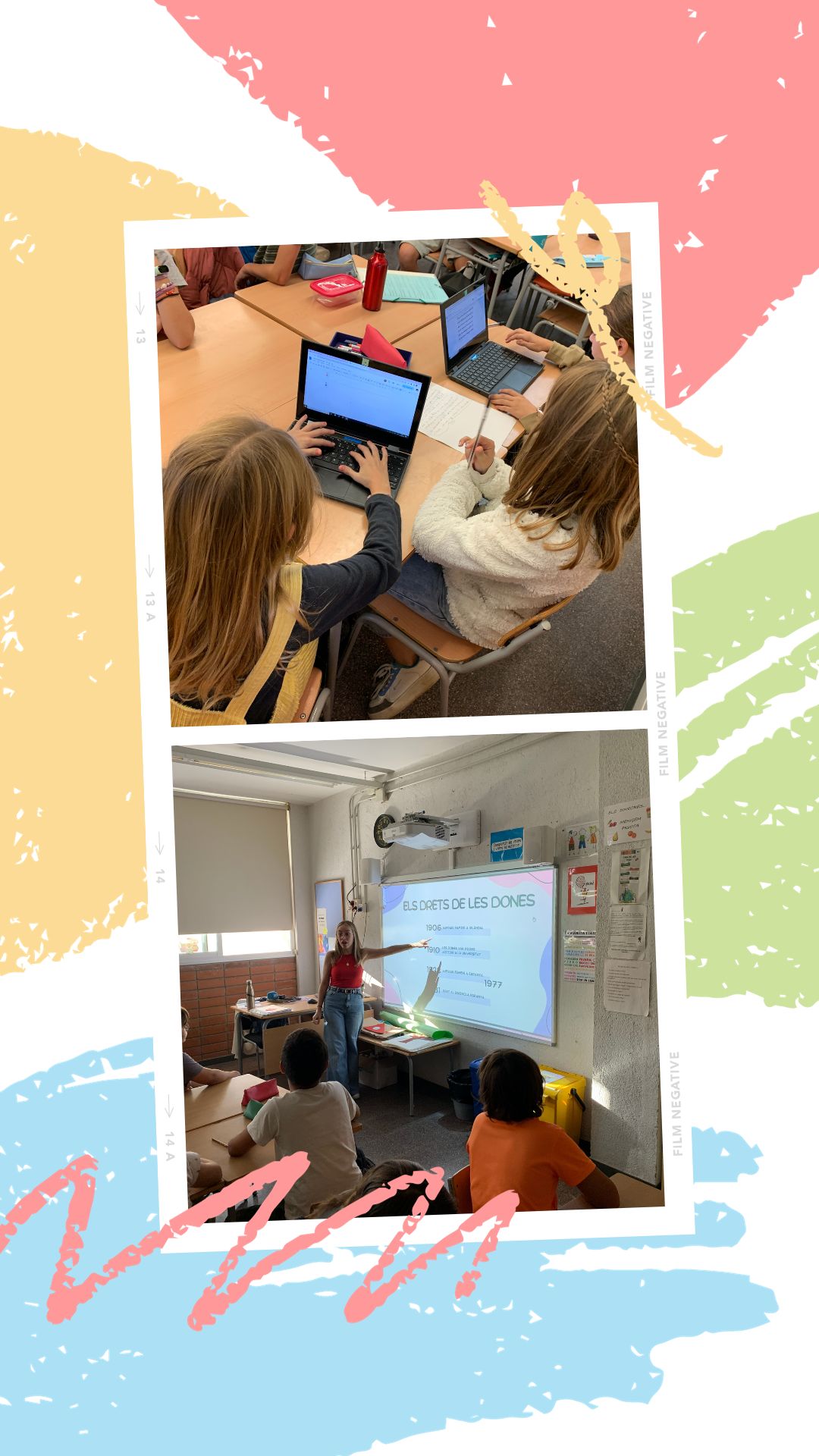 La Laura ens va fer un Canva molt divertit i interessant! Ens va posar uns vídeos d’unes dones que ens explicaven els drets que no tenien de nenes uns anys enrere, com per exemple: no podien anar amb bicicleta perquè si no se’ls hi podia veure les calcetes i aleshores només podien anar amb patinet perquè no se’ls hi veiessin les calcetes. També, havien d’anar sempre amb faldilles. Un altre exemple que ens van compartir és que les nenes, tampoc podien anar a l’escola i els nens, en canvi, si. Per últim, els nens podien jugar a futbol i les nenes no.
