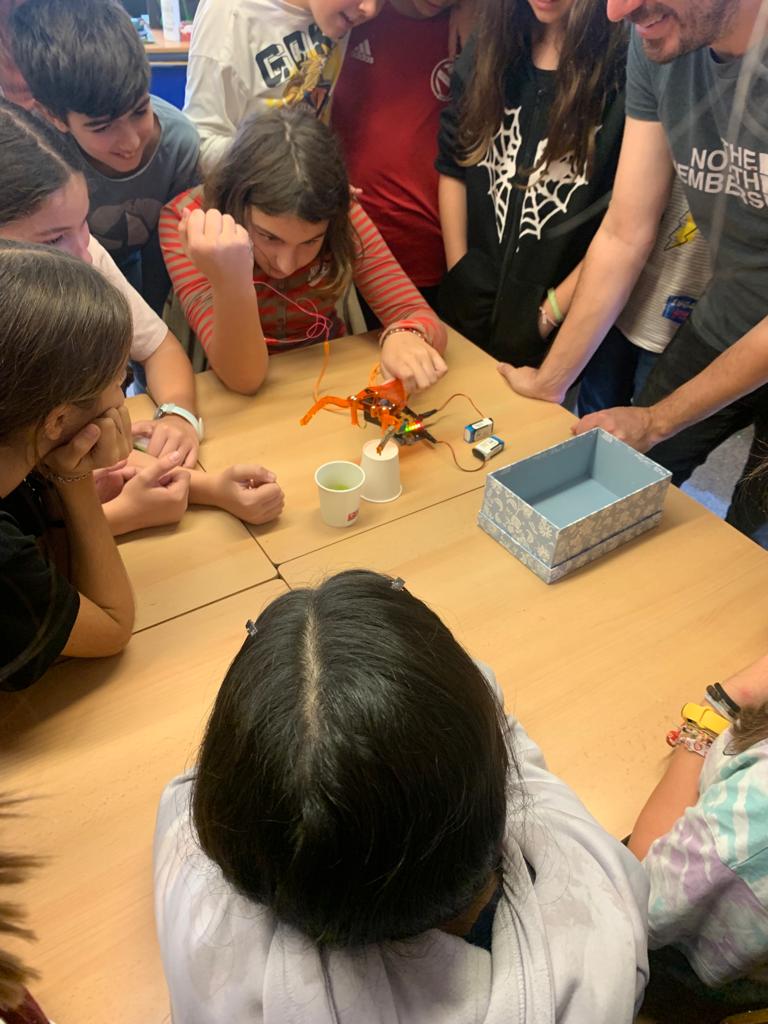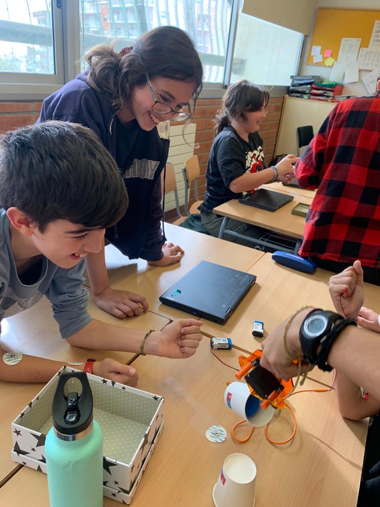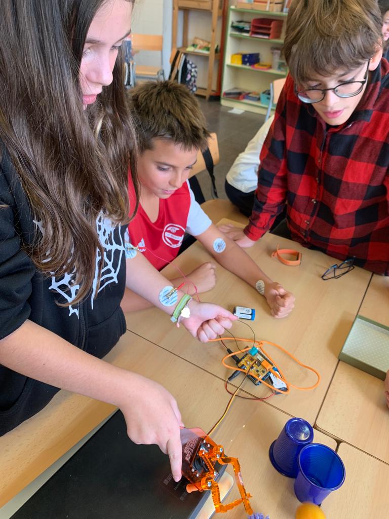 Experiment 2: ens van posar uns elèctrodes al braç de manera que quan fèiem una contracció, li donàvem ordres a un robot per fer una acció. L’objectiu era aconseguir agafar una pilota i retornar-la a un got fent contraccions amb el nostre braç.