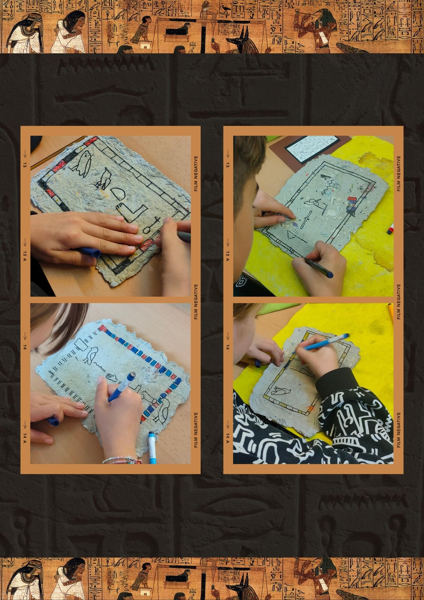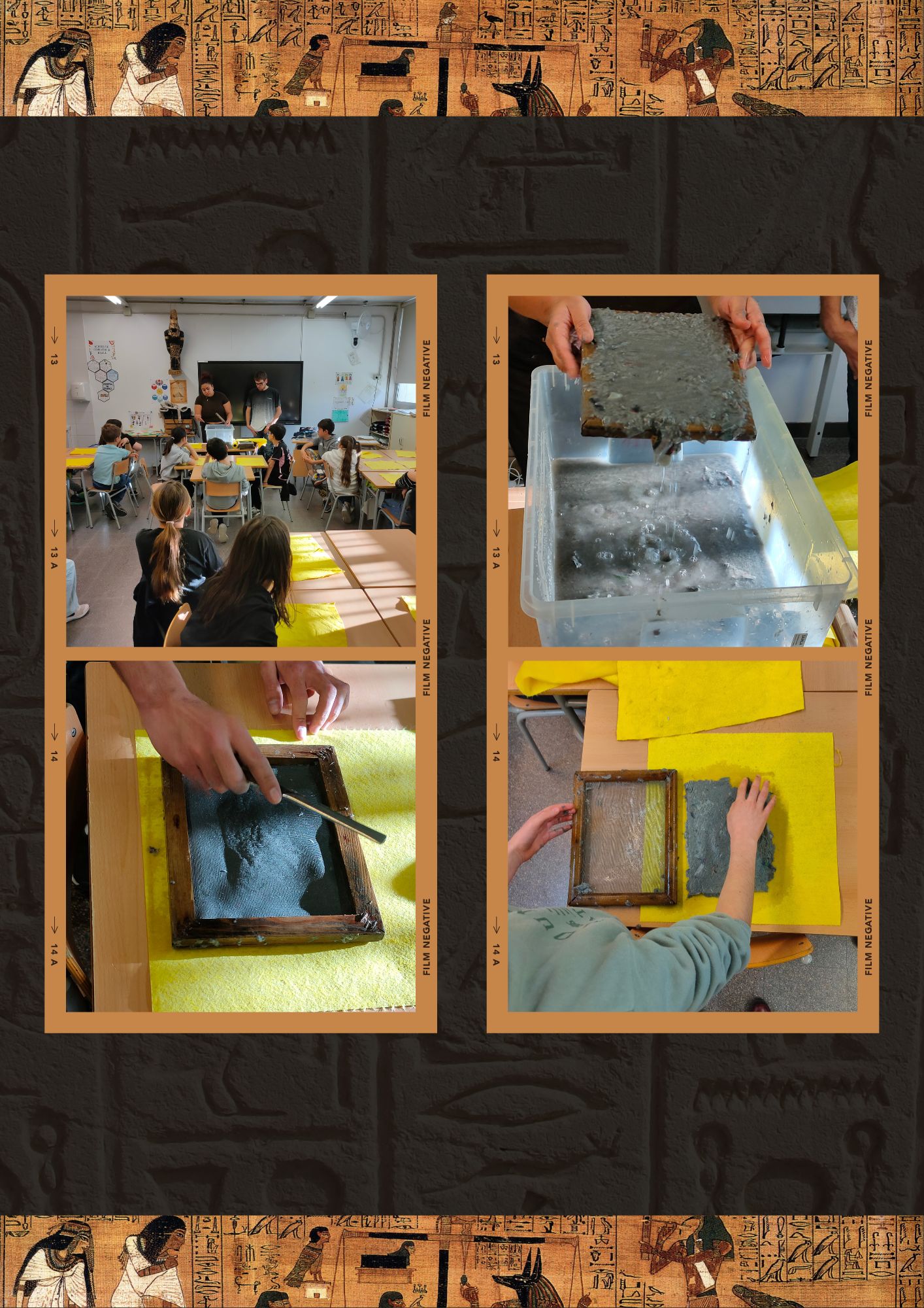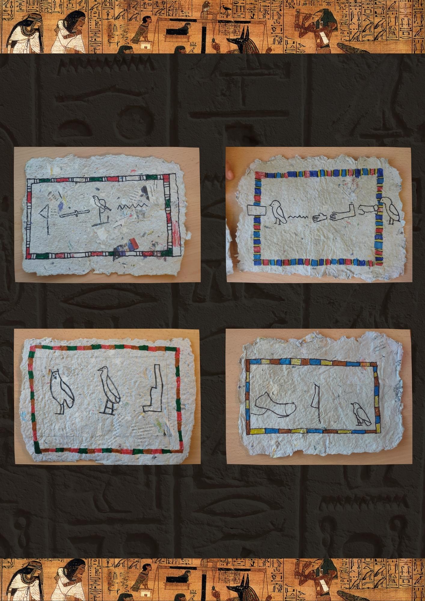 Primer, vam deixar paper de diari en remull tot un cap de setmana. Després, el vam triturar per fer una pasta i, amb molta cura, el vam estendre sobre uns marcs especials. Un cop fet, vam deixar el paper assecar durant 3 dies per tenir un resultat perfecte. Però això no és tot: amb els nostres papirs reciclats, vam escriure els nostres noms en jeroglífics.