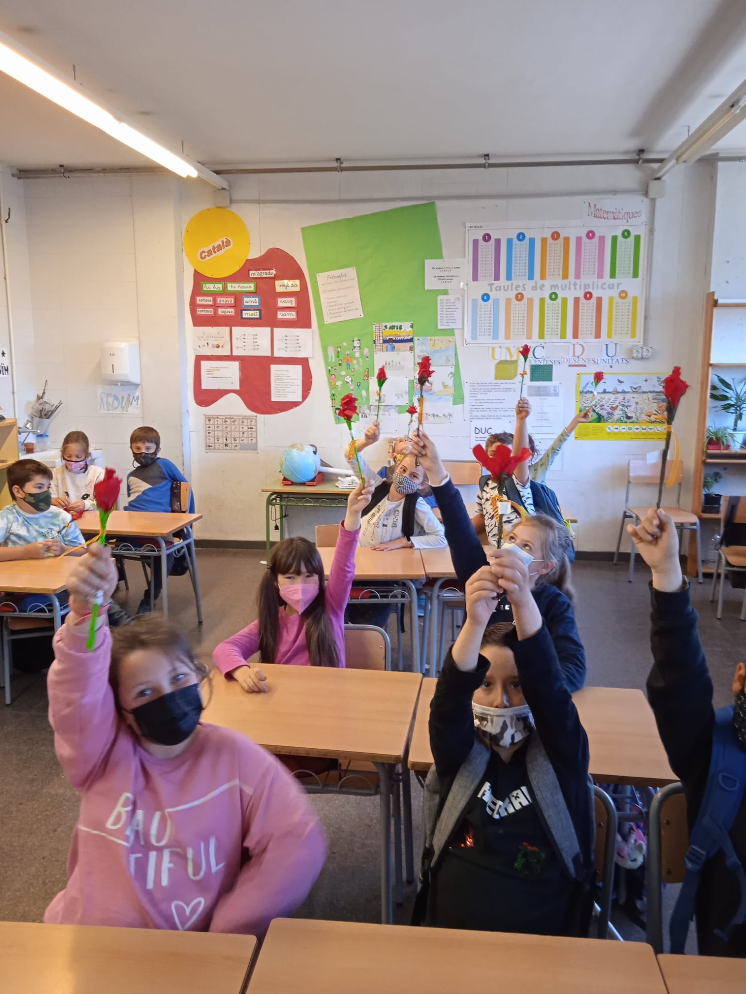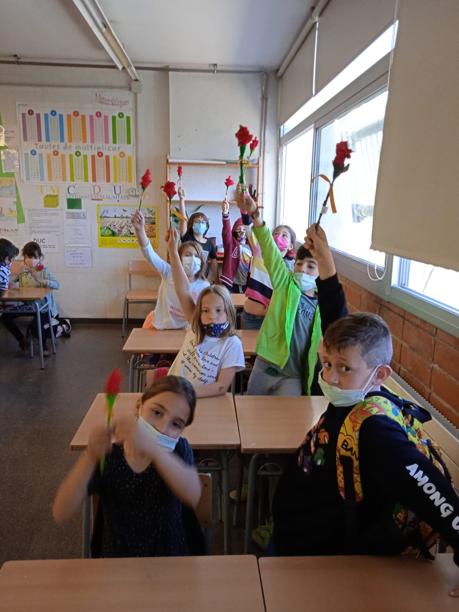 Aquest mes d’abril hem celebrat Sant Jordi fent una rosa de paper pinotxo. Per fer-la hem observat, plegat, retallat, desplegat, estirat, rebregat i enganxat paper per fer els pètals i el sèpal. Després hem continuat fins fer la tija i, per acabar, amb una cinta de la senyera de roba li hem fet un llaç.