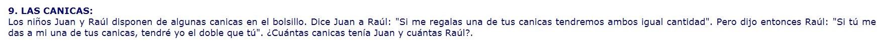 “RETO SEMANAL 6: Juan y Raúl tienen unas cuantas canicas en el bolsillo. Juan le dice a Raúl: “Si me regalas una de tus canicas tendremos ambos el mismo número de canicas”. Raúl, entonces, le responde: “Si tú me das a mi una de tus canicas, yo tendré el doble de canicas que tú”. ¿Cuántas canicas tiene Juan y cuántas canicas tiene Raúl?.