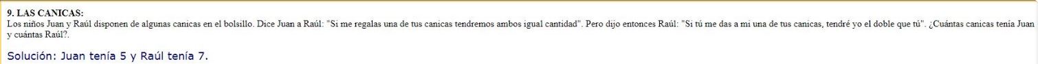 Solución del Reto semanal 6: Juan tiene 5 canicas y Raúl 7. Si Juan le da una a Raúl, Juan tendrá 4 y Raúl 8 (el doble de 4). Si Raúl le da una canica a Juan, los dos tendrán 6 (el mismo número de canicas).