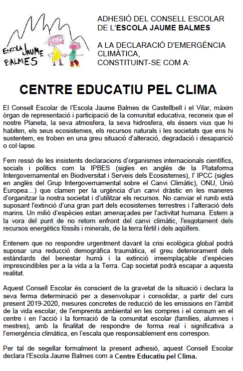 El Consell Escolar de l’Escola Jaume Balmes ha signat l’ADHESIÓ AL MANIFEST D’EMERGÈNCIA CLIMÀTICA, proclamant-se com a Centre Educatiu pel Clima.