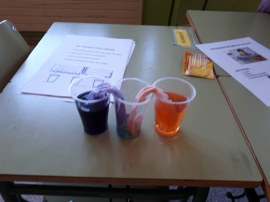 La comunitat dels grans durant el segon i tercer han iniciat el taller d’experiments. Es divideixen en tres grups, un per cada experiment. Els alumnes han de seguir les instruccions que tenen en cada fitxa per poder realitzar l’experiment. Un cop acabat n’han de treure les conclusions i anotar-les en la fitxa del grup. En