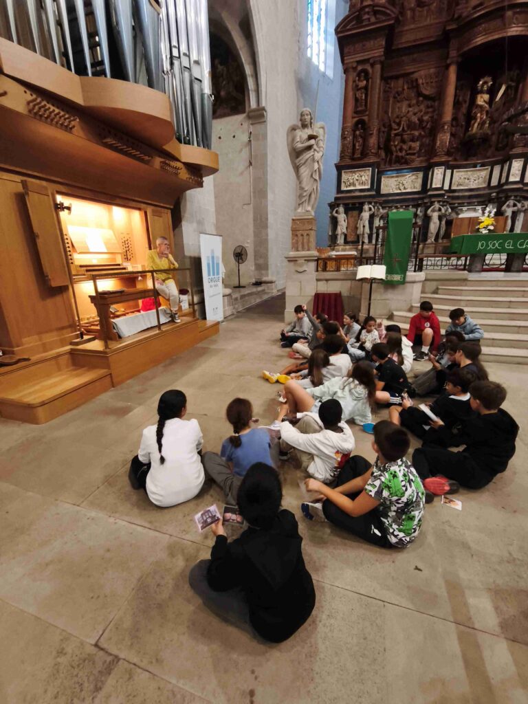 Durant la visita, vam aprendre com funciona un orgue, quantes tecles i tubs té, i com l’organista fa servir les mans i els peus per tocar-lo. També, vam poder escoltar algunes peces en directe, i va ser emocionant sentir com el so omplia tot l’espai!