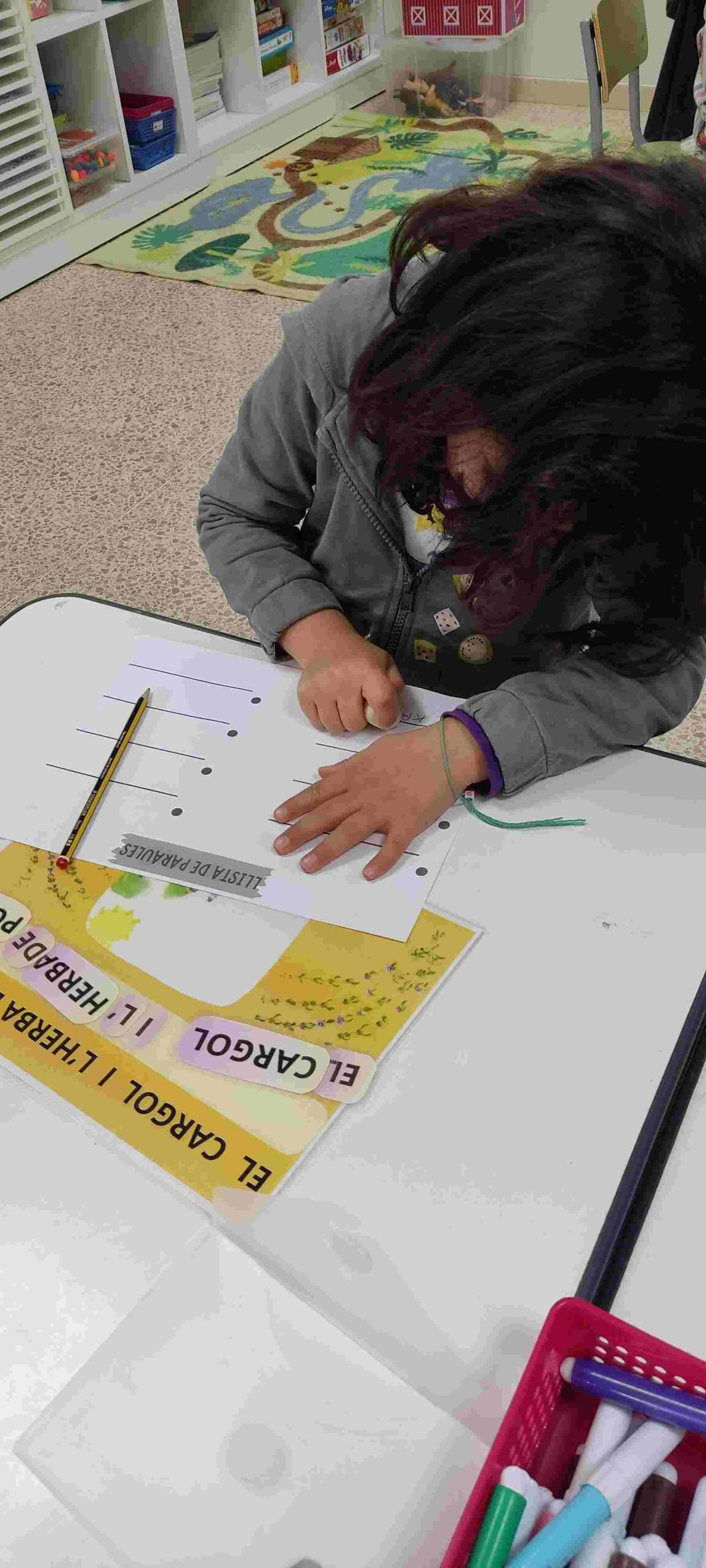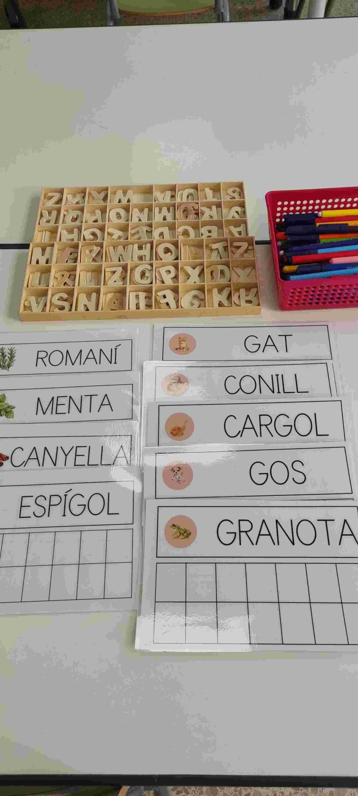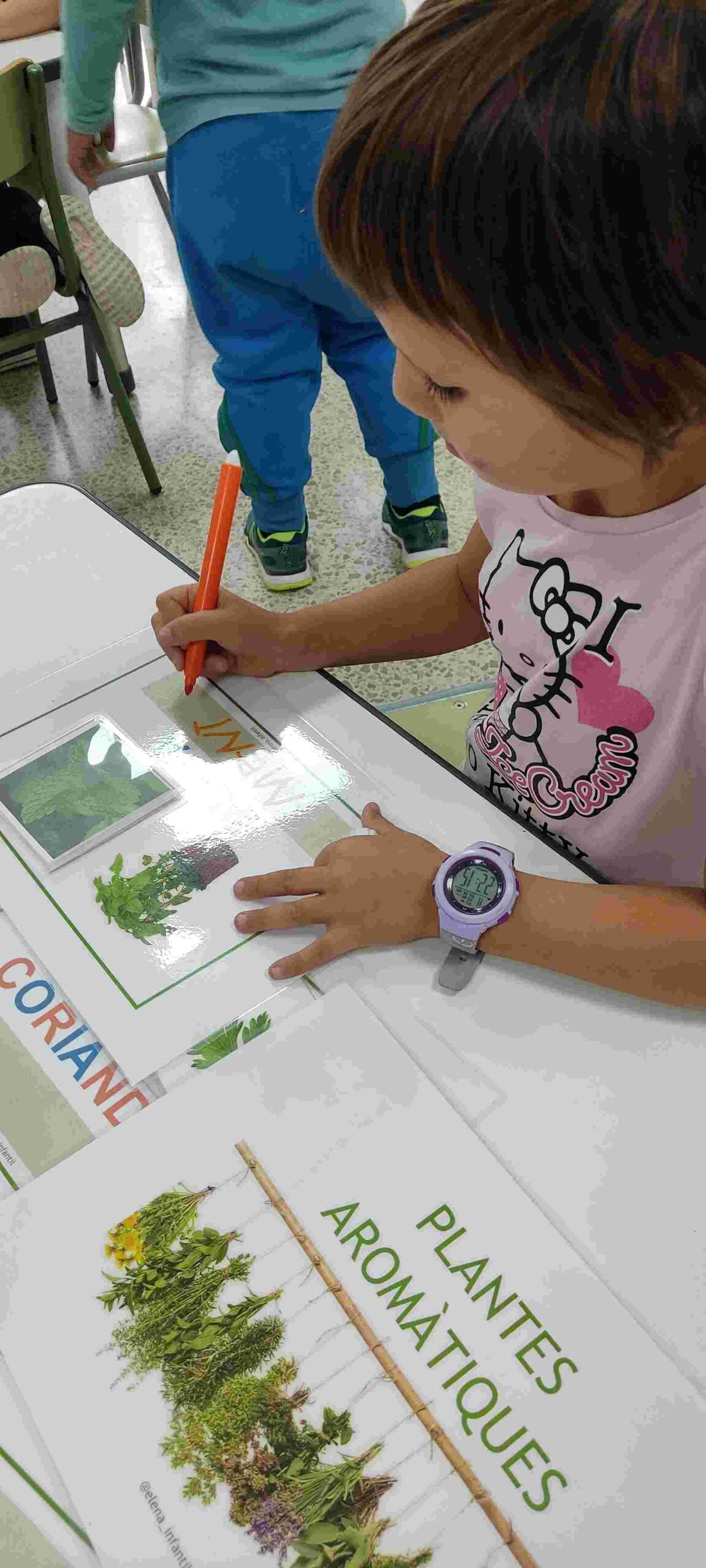 A més, hem ampliat el vocabulari coneixent paraules noves relacionades amb el món vegetal i hem treballat la lectoescriptura, identificant i escrivint els noms de les diferents plantes: menta, romaní, espígol, farigola, camamilla…