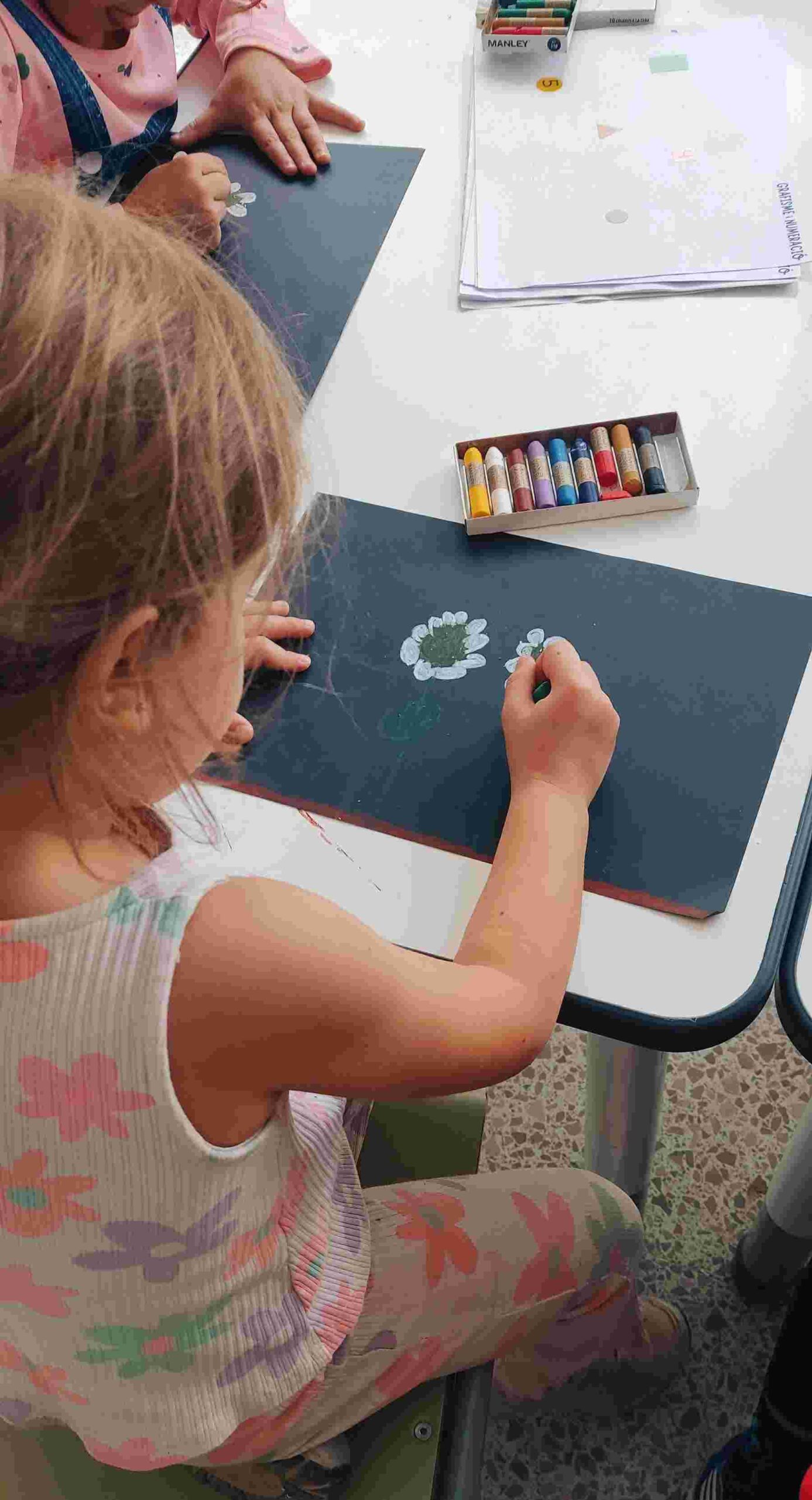 També hem conegut la camamilla, que hem dibuixat amb ceres sobre un fons negre per ressaltar-ne el blanc dels pètals i el groc intens del seu centre. El contrast dels colors ens ha donat lloc a unes obres plenes de llum i vida.