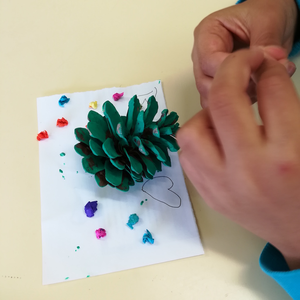 Al grup de primària, vam crear uns arbres de Nadal amb pinyes del bosc i al grup d’infantil un ninot de neu amb un rotllo de paper WC.