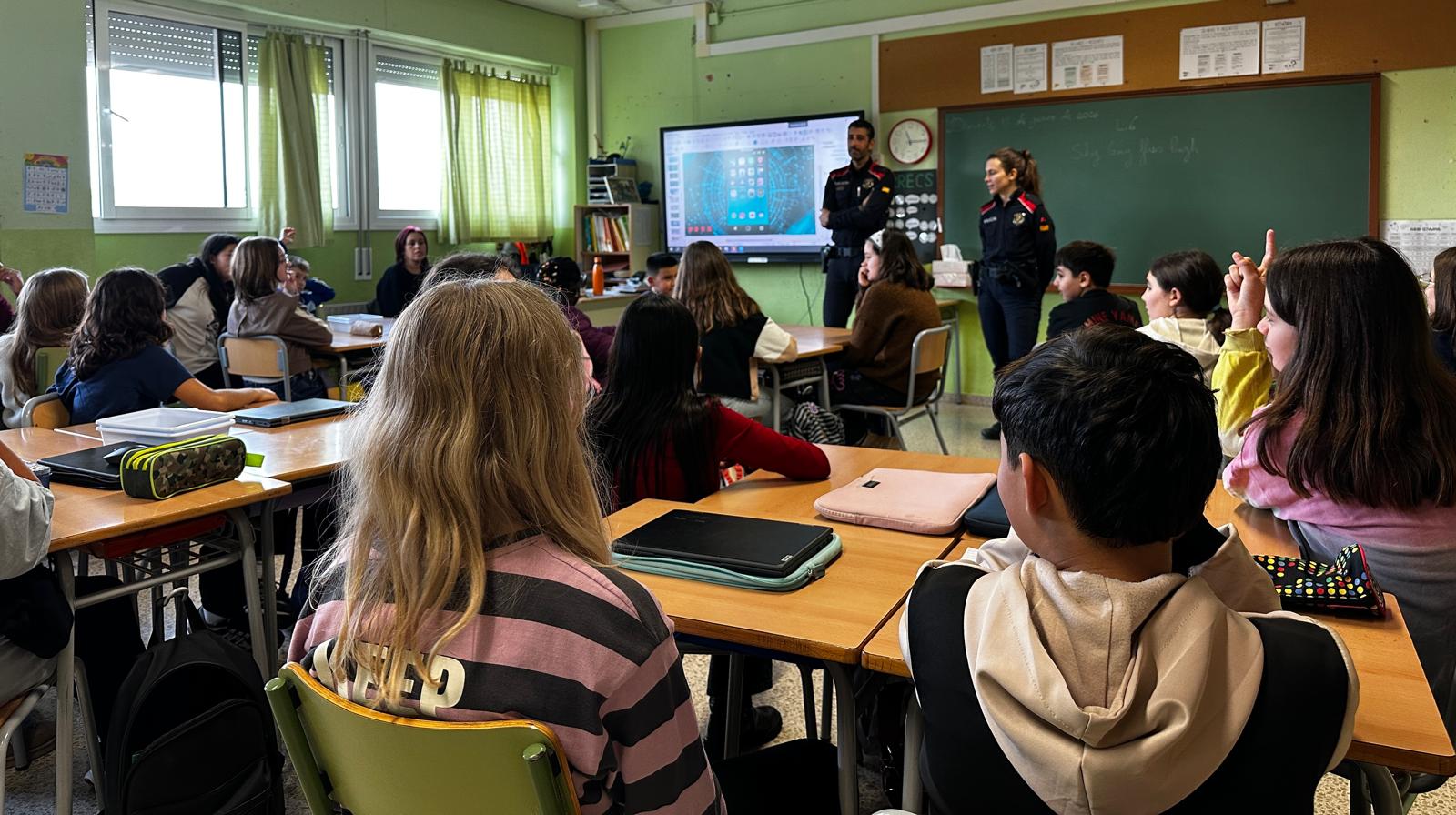 Avui, dos agents dels mossos d’esquadra han vingut a la nostra classe per parlar-nos dels perills als quals els nens i les nenes estem exposats a la xarxa. Hem parlat de l’ús responsable del mòbil i de les xarxes socials i hem conegut diferents casos reals que ens han fet pensar en com actuem nosaltres mateixos quan estem connectats a les xarxes i com hem d’actuar davant de situacions potencialment perilloses.