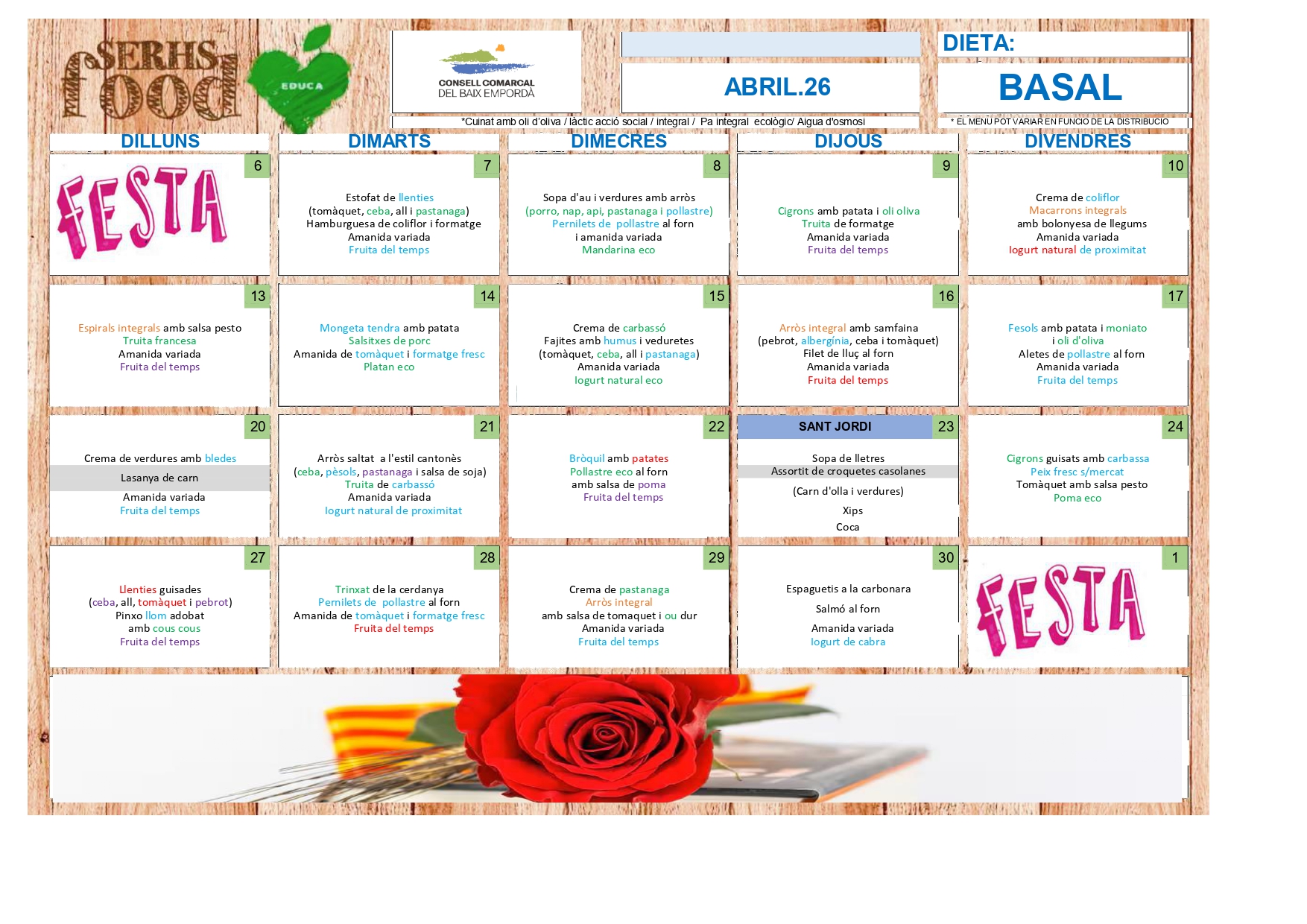 Per consultar la resta de menús (al·lèrgies, intoleràncies, etc) cal que us registreu a la pàgina web del Grup Serhs o a l’aplicació SERHS Food Educa. El codi de centre és el 50629