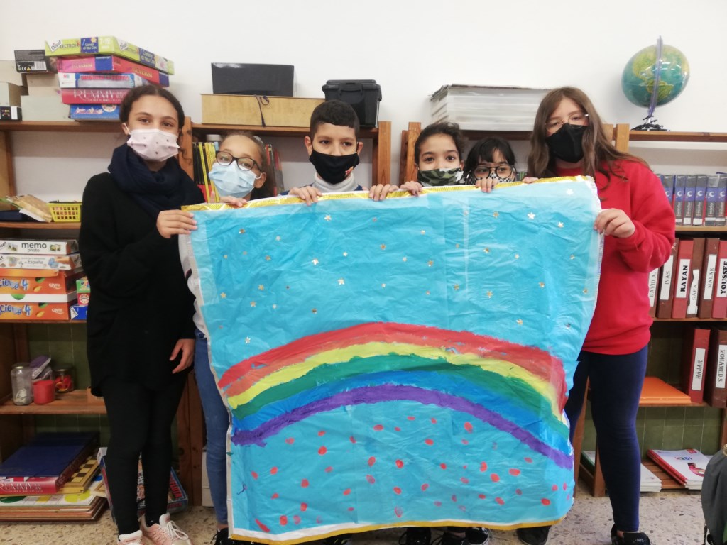Els alumnes de sisè, amb en Joan (EL TIS), vam fer una dinàmica sobre les emocions, però era una mica difícil perquè no podíem parlar amb els companys/es. Teníem que dibuixar com ens sentíem cada un de nosaltres. Un grup va fer un arc de Sant Martí i l’altre grup va fer un mural amb emogis.