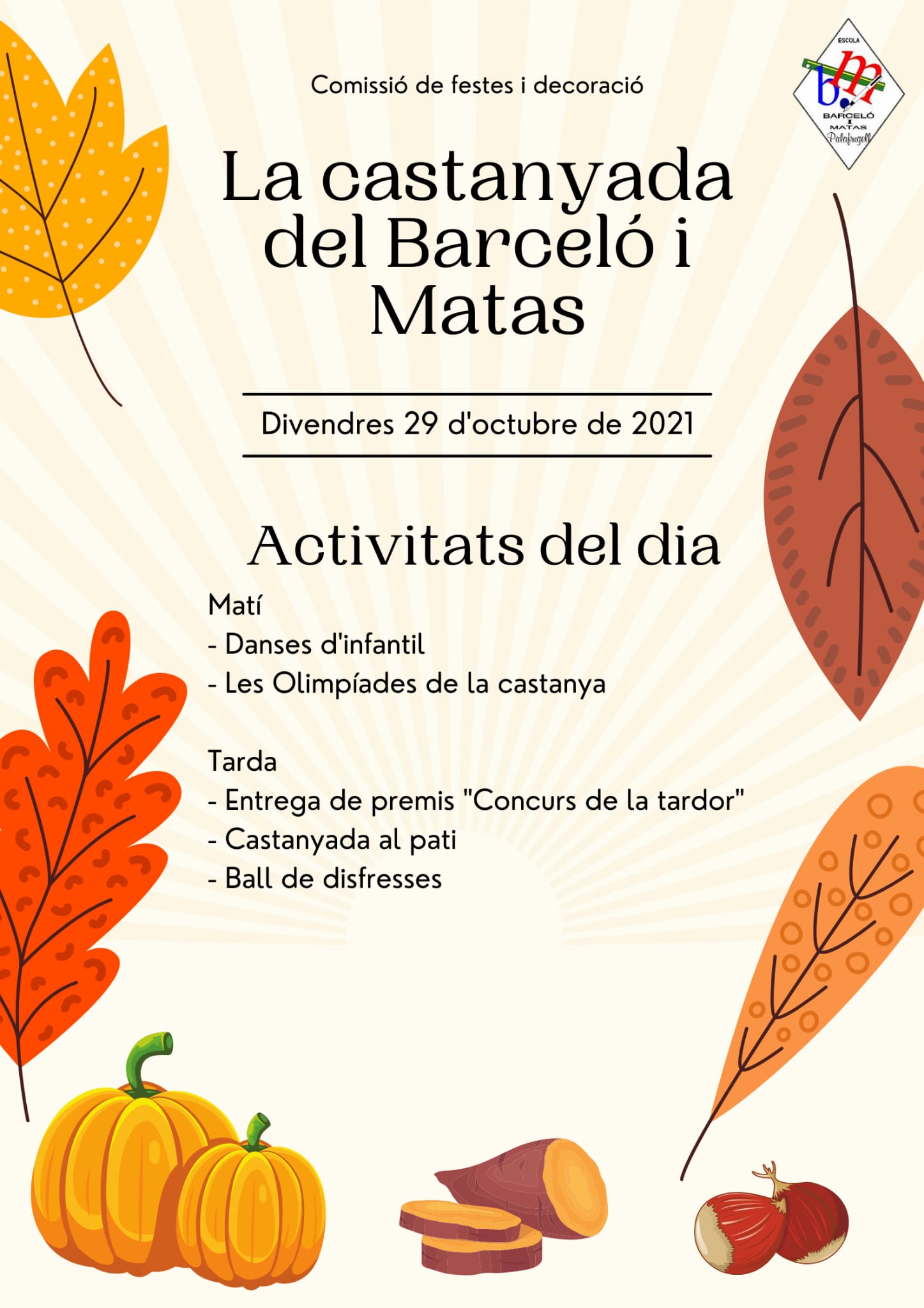 Divendres 29 d’octubre al matí, després d’un curs de pausa, tornem a veure BALLAR als infants d’educació infantil i, a primària, a gaudir de les OLIMPÍADES DE LA CASTANYA. A la tarda, farem l’entrega de premis del concurs, menjarem castanyes ben torrades i ballarem tot disfressats de castanyers, castanyeres o de Halloween.