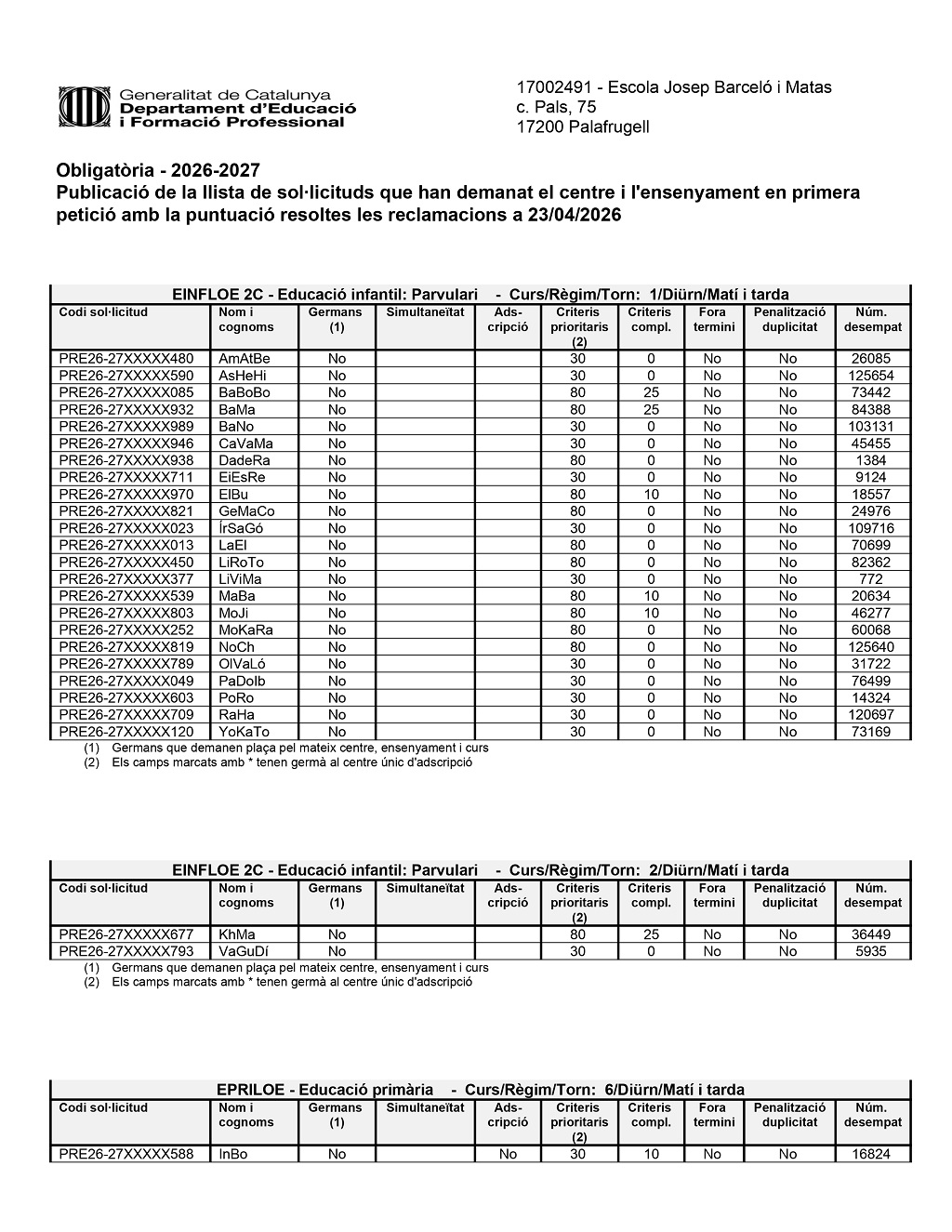 El llistat amb la puntuació definitiva (barem) dels infants preinscrits al centre és la següent: