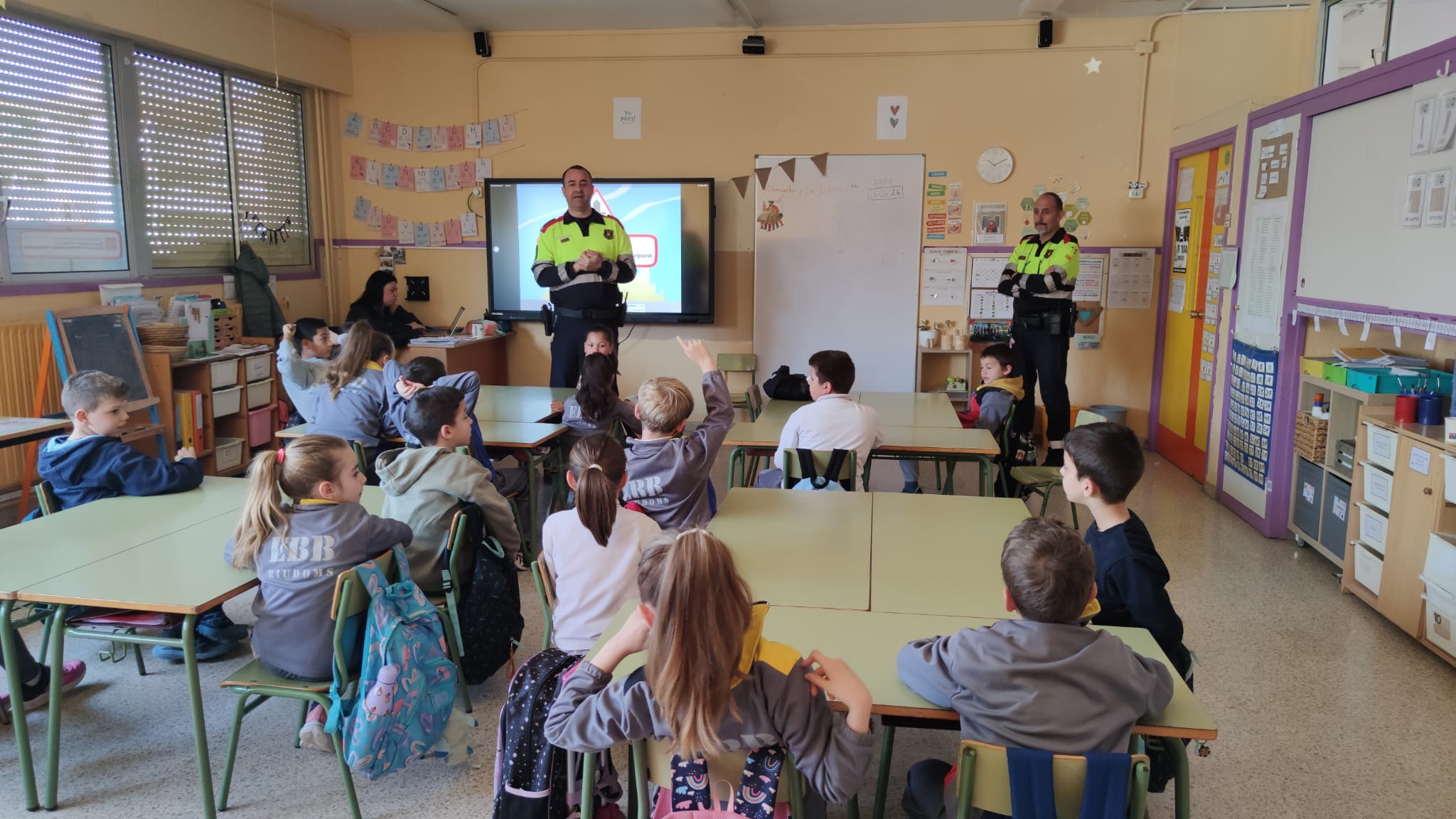 Ens van explicar que no eren uns policies qualsevols, sinó de trànsit, ens van fer explicar quines eren les majors causes d’accidents. Ens van començar a preguntar algunes d’aquestes causes i les vam endevinar gairebé totes excepte l’ última que era la més difícil de totes. Per endevinar-la, ens van fer inventar una petita història del que no feia un nen quan estava sol i del que feia quan estava amb amics o acompanyat.